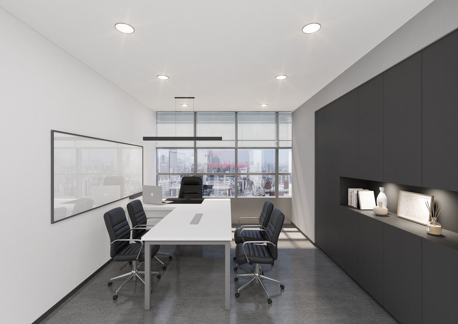 대표실 내 회의 공간 외에도 더 많은 인원을 수용할 수 있는 대회의실과소회의실이 별도로 구성되어 있습니다. 중앙 메인 테이블 외에도 사이드 벽면에 쇼파형 벤치를 추가로 설치하여 활용도를 높였습니다.벽면 디자인과 다양한 조명을 활용하여 모던한 분위기를 연출했습니다. 대회의실 보다는 심플한 느낌의 소회의실입니다. 화이트&그레이 인테리어로 깔끔한 모습입니다.