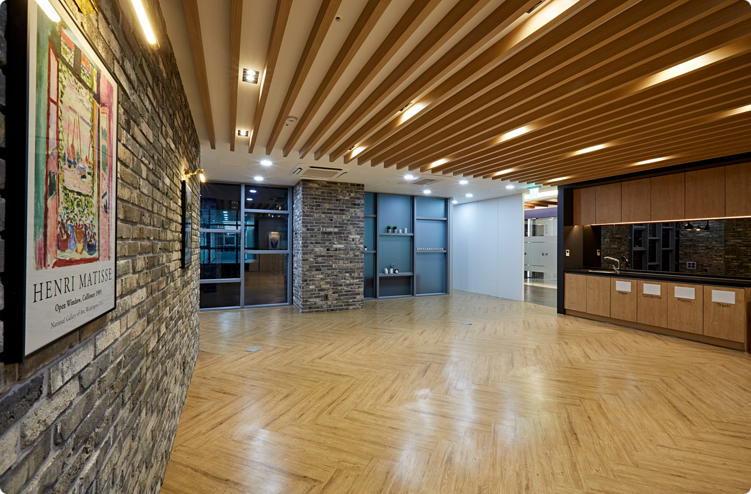 카페테리아와 복도의 벽면은 벽돌 타입의 타일을 하나하나 부착하여 완성한만큼 퀄리티가 우수하며 전체적인 조화로움을 많이 신경썼는데요.