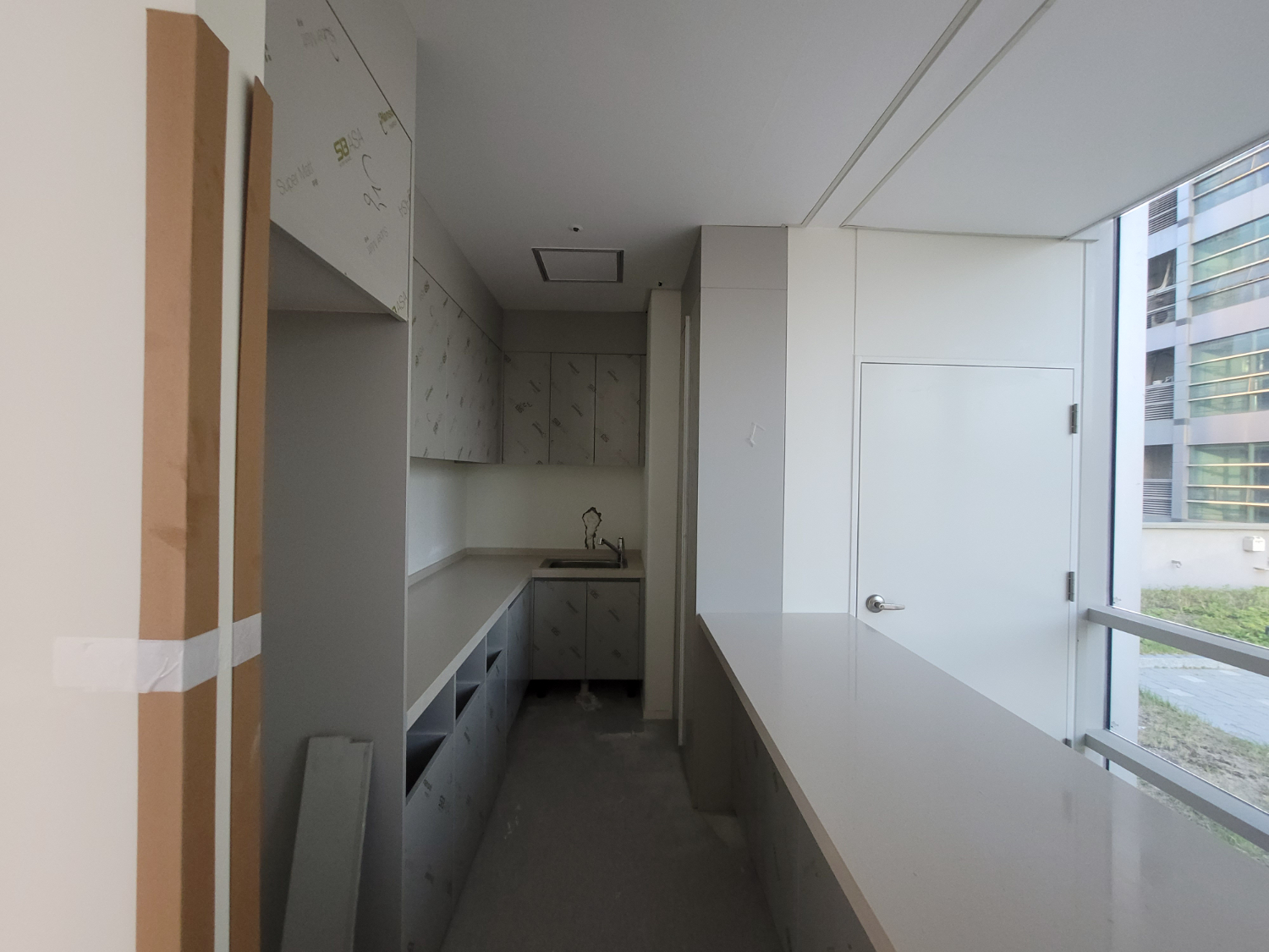 직원들의 워라밸을 높여 줄 다이닝 공간입니다. 카페테리아로 사용되며 간단한 식사를 즐길 수 있도록 아일랜드 식탁을 잊지않았고 수납공간 확보를 위한 상하부장도 마련했습니다. 또한 특이한 매력의 조명으로 시선을 사로잡고 냉장고장도 시공하여 깔끔하게 모든 것이 수납될 것입니다.