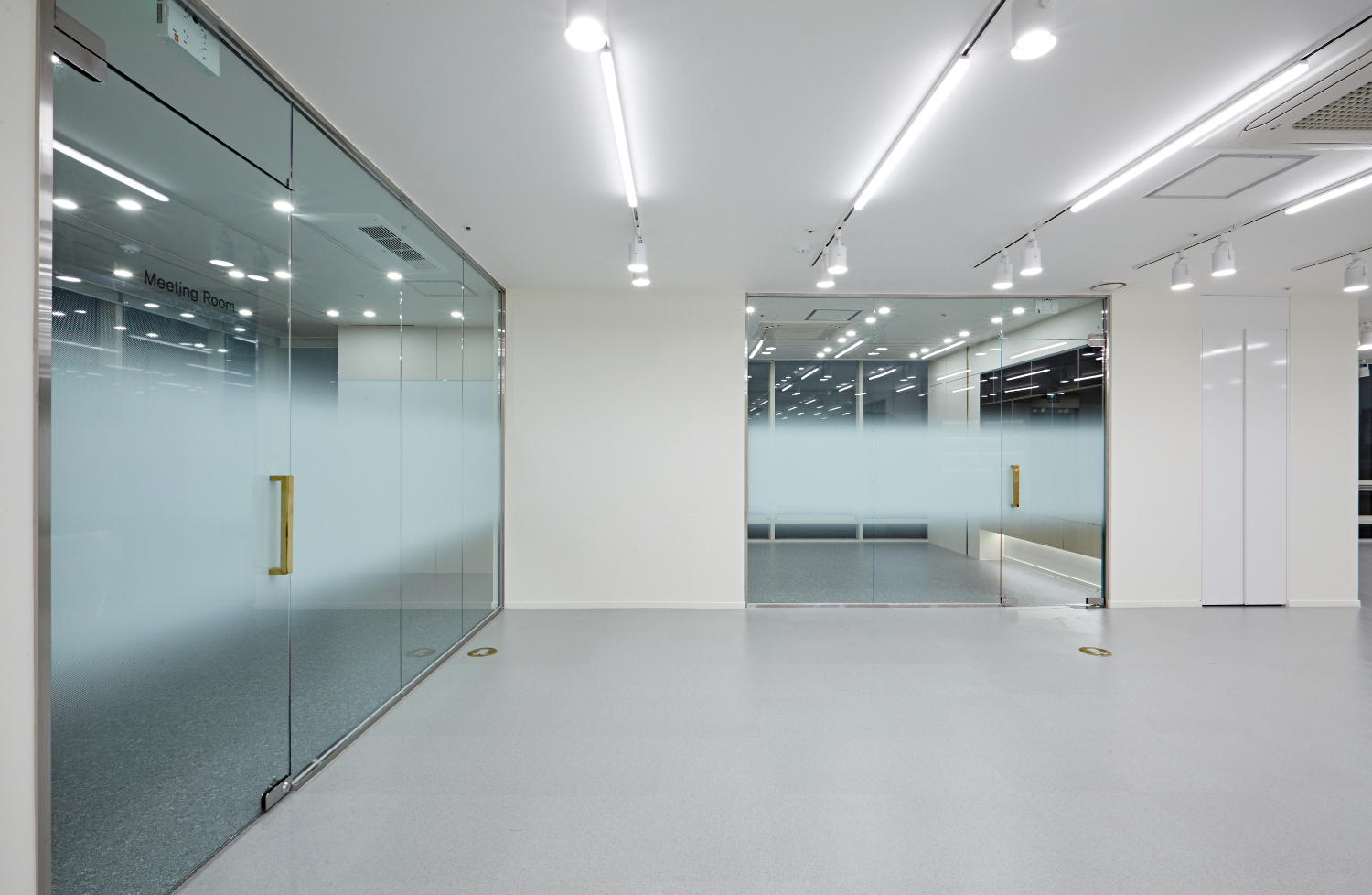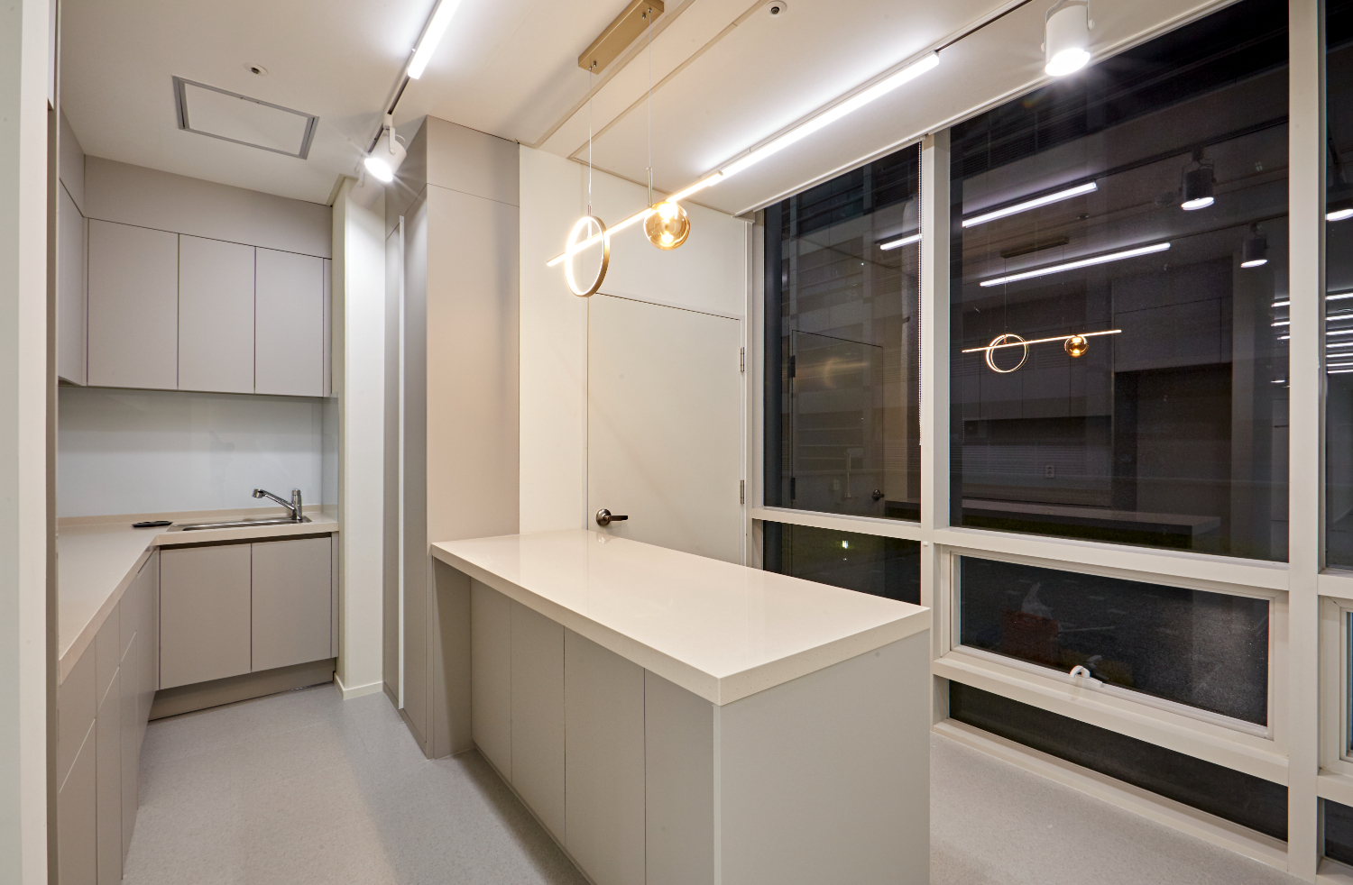통창으로 연출하는 것과 더불어 공간별 도어도 투명 유리로 시공하였고, 가운데에만 불투명 필름을 사용해 프라이빗한 공간을 조성하였습니다. 또한 천장에는 ㅡ자 조명과 원형 조명을 번갈아 사용하여 밝게 만들어 주었어요