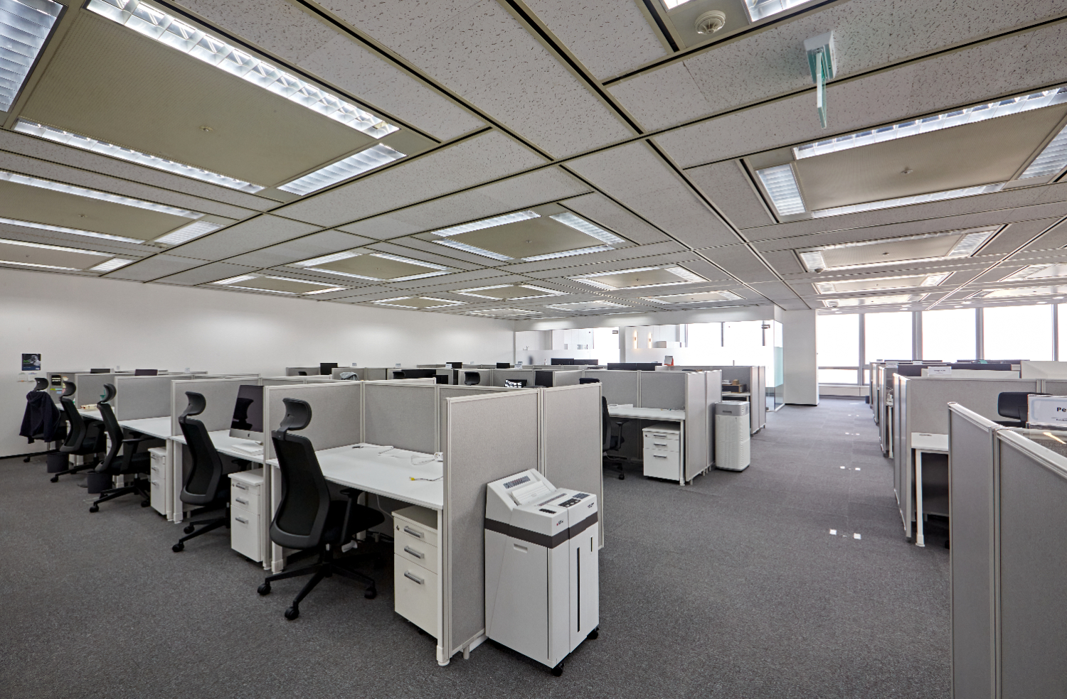 직원들이 각자의 업무에 집중하는 사무공간은 체커보드의 바닥과 비슷한 무늬로 이루어진 천장이 포인트라고 할 수 있는데요. 모두 네모라는 도형으로 통일하였으며 그레이 색상으로 맞추어 전체적인 조화를 이루었습니다