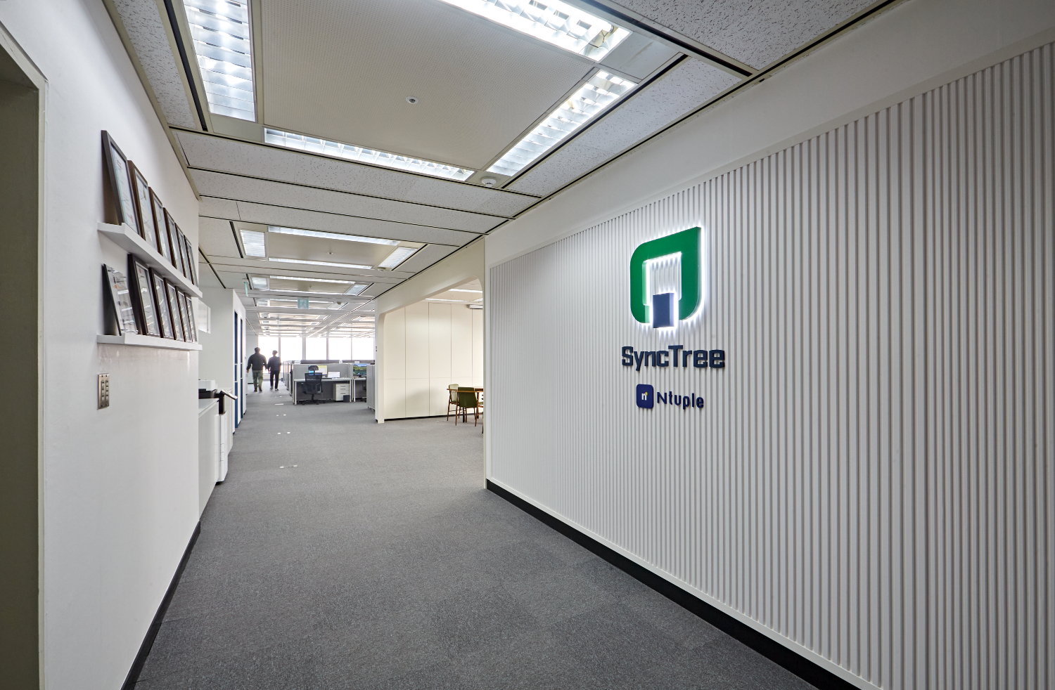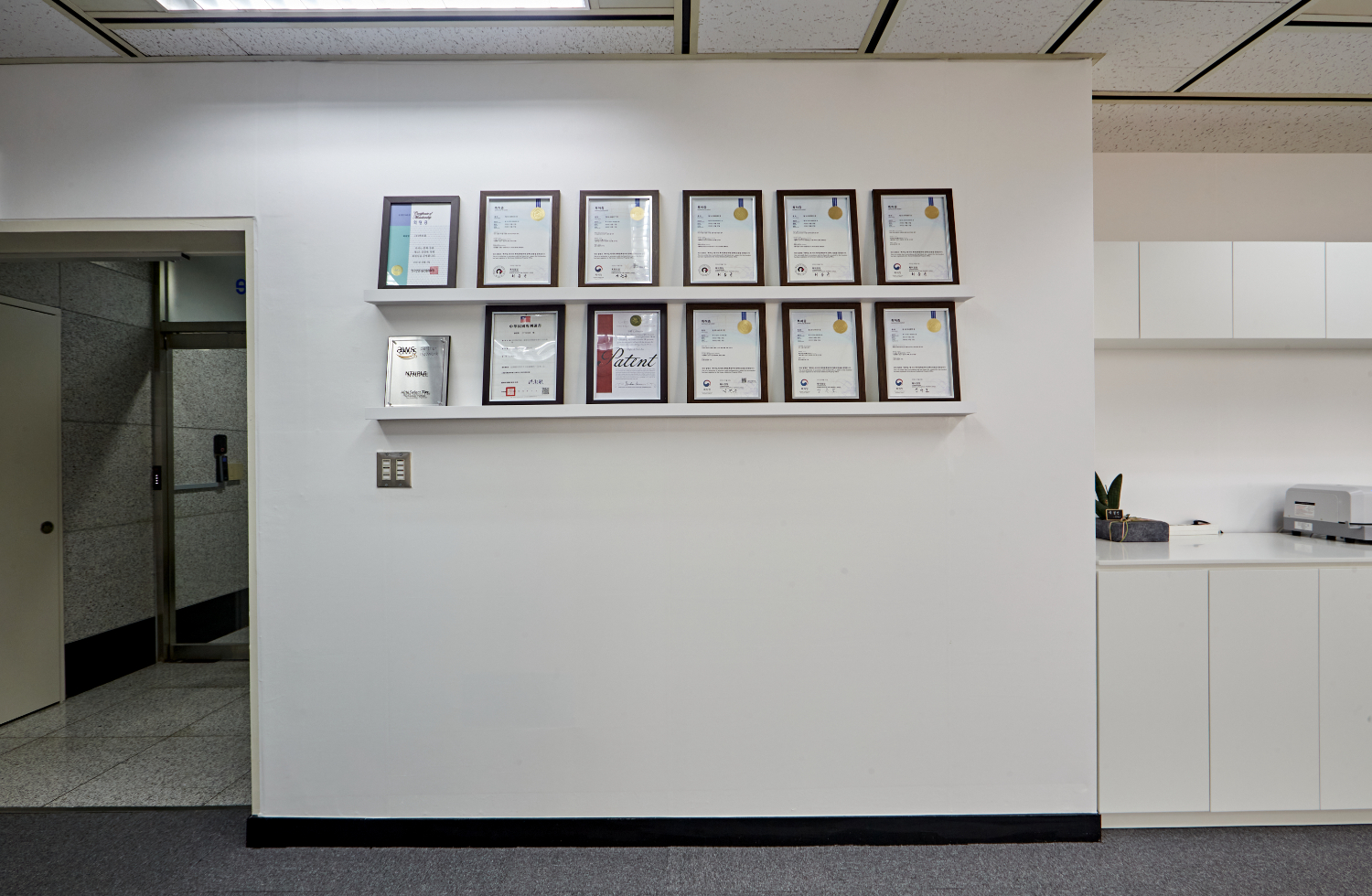 들어가는 입구 공간입니다. 화이트 템바보드로 전면을 채운 벽에는 해당 회사의 로고가 입체적으로 부착되어 있습니다. 또한 led 조명이 후면에 매립되어 보다 밝고 집중도를 높여줍니다.