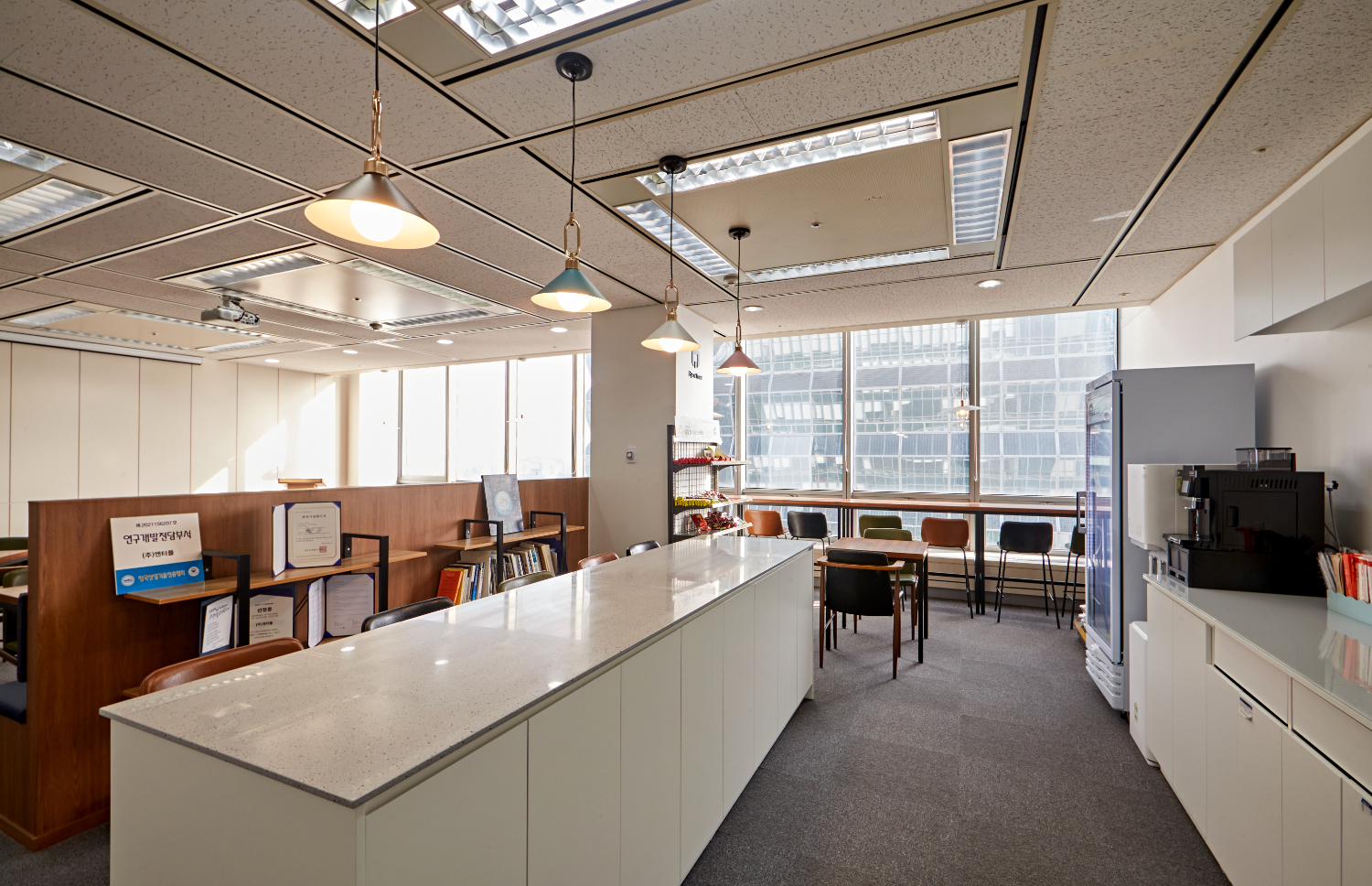 여의도 회사인테리어에서 카페테리아도 빼놓을 수 없는 공간입니다. 요즘 새로 생겨나는 사무실 인테리어에서는 직원들의 휴식 시간을 보장하고 워라밸을 높여주는 카페테리아가 필수 옵션처럼 생각되고 있는데요. 넓고 쾌적한 공간속에 테이블을 다양하게 배치하여서 언제든지 쉬고싶을 때 쉴 수 있게 만들었습니다.
