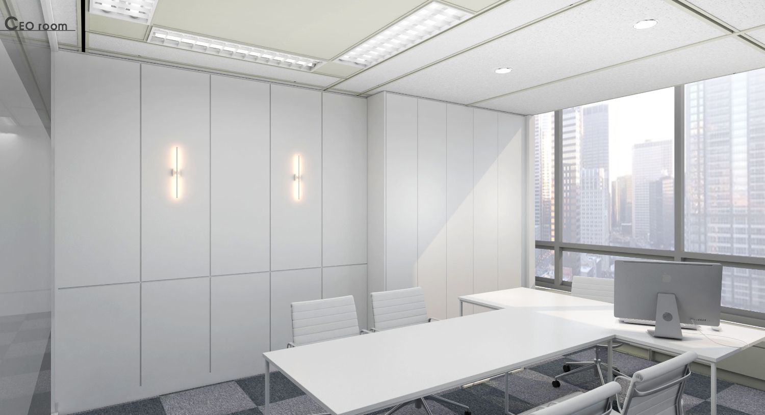 ceo룸부터 살펴보자며 T자형식으로 테이블을 배치하였습니다. 사장님의 개인 업무에 대한 집중도도 높이고 언제든지 직원들과 소통할 수 있는 테이블을 배치하여 상시 회의를 할 수 있도록 만들었습니다. 또한 벽면에는 벽등을 일정한 간격으로 배치하여 고급스러운 무드로 완성시켰으며 탁 트인 통창과 어우러집니다.