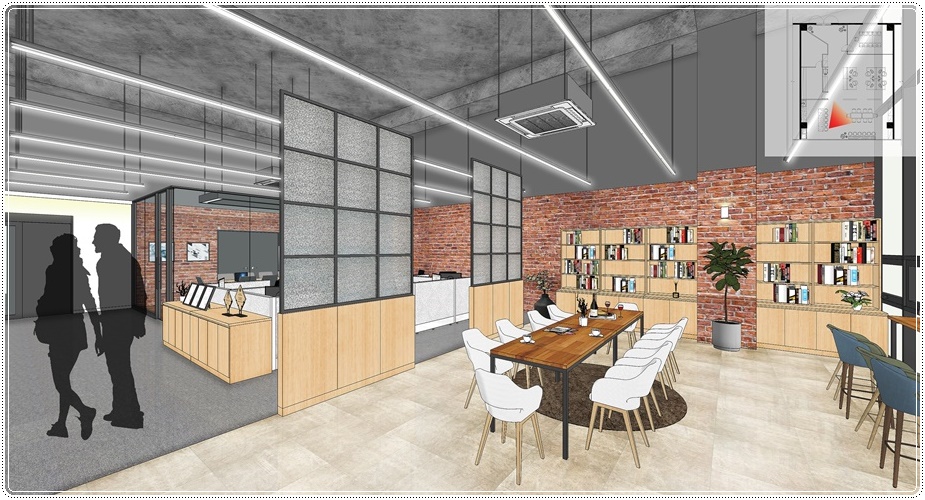 오픈형 노출 천정을 활용해 공간이 더욱 넓어 보이게 했고 라인 조명을 적용해 조도를 확인했으며 노출 천장과 잘 어울리는 파벽돌로 벽면을 마감해 빈티지하면서 감각적인 인테리어로 활용했습니다. 빈티지하고 거친 느낌의 파벽돌 벽면에 세련되고 깔끔한 조명 사인물로 회사명과 로고를 제작해 부착하면 극명한 대비를 통한 포인트가 될 수 있습니다. 사무와 관련된 기기와 가구는 탕비실 벽면으로 몰아 편리하게 사용할 수 있도록 했습니다.