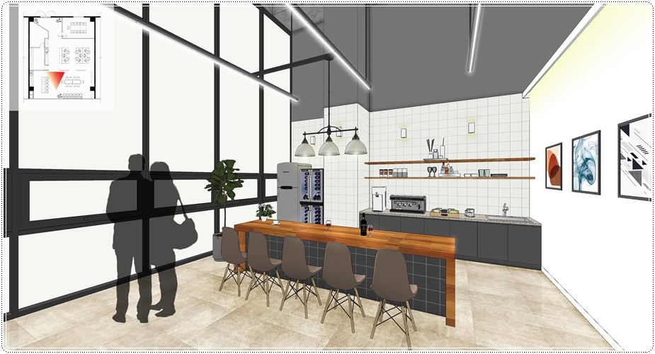 카페테리아는 전체적으로 화이트로 마감해 최대한 화사하고 쾌적한 분위기를 조성할 수 있도록 계획했습니다. 벽면에는 간단한 식음료를 만들 수 있는 싱크대를 계획하고 무지주 선반을 적용해 답답해 보이지 않도록 했으며 타일을 시공해 청결하게 관리할 수 있도록 했습니다. 아일랜드식탁 스타일의 바테이블을 계획해 휴게 공간과 분리되도록 했으며 팬던트형 조명을 적용해 때에 따라 다양한 분위기를 조성하도록 했습니다.