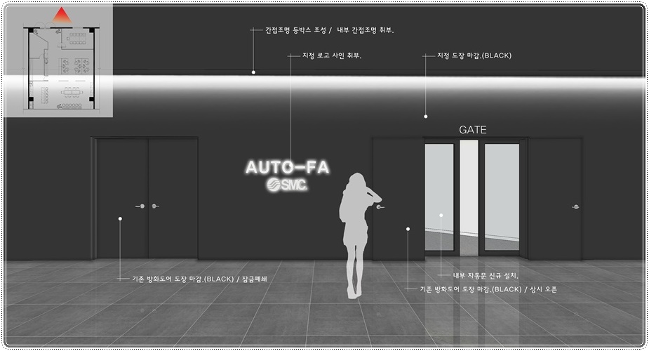 두 개의 문 중에서 하나는 잠금 폐쇄하고 다른 하나만 사용하도록 함으로써 내부 공간을 충분히 활용할 수 있도록 하면서 가독성을 높였습니다. 출입문은 방화도어는 블랙 커러로 마감하고 도어는 자동문을 신규로 계획해 사용성과 편의성을 높였으며 블랙 컬러와 가장 잘 어울리는 유리 도어를 적용했습니다.