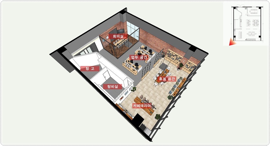 회의실은 외부 방화문을 폐쇄하면서 확보한 공간에 배치했는데요, 유사시에는 안에서 열고 나갈 수 있다는 장점이 있습니다. 벽면은 파벽돌로 마감하고 유리 가벽으로 공간을 구분해 독립적으로 사용하지만 개방성도 확보할 수 있어 답답해보이지 않고 디자인적으로도 활용할 수 있습니다.