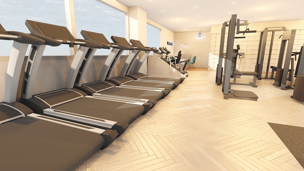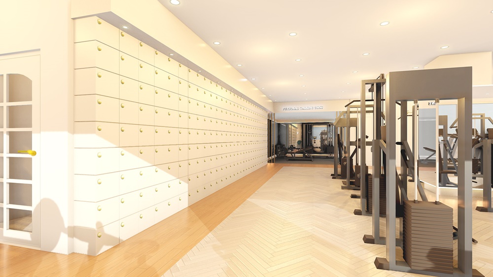 창측에는 런닝머신, 사이클머신 등을 둬 운동하는 동안 지루하지 않도록 했고 중앙에는 근력 운동을 위한 머신을 두어 운동에 집중할 수 있도록 했으며 거울이 설치된 곳에 프리웨이팅존을 구성해 개인 운동에 몰두할 수 있도록 했습니다. 프리웨이팅존은 무게 운동을 많이 하는 특성을 고려해 바닥에 고무 매트를 시공해 충격과 소음을 흡수하도록 했습니다.