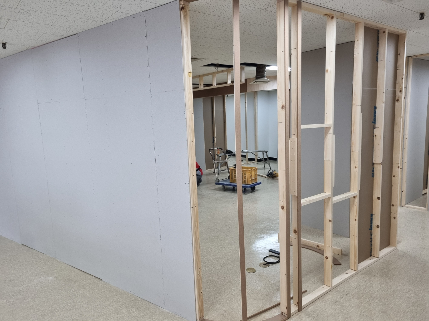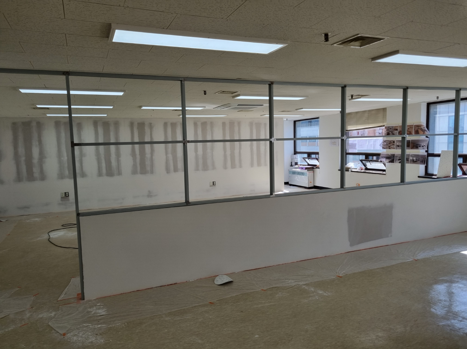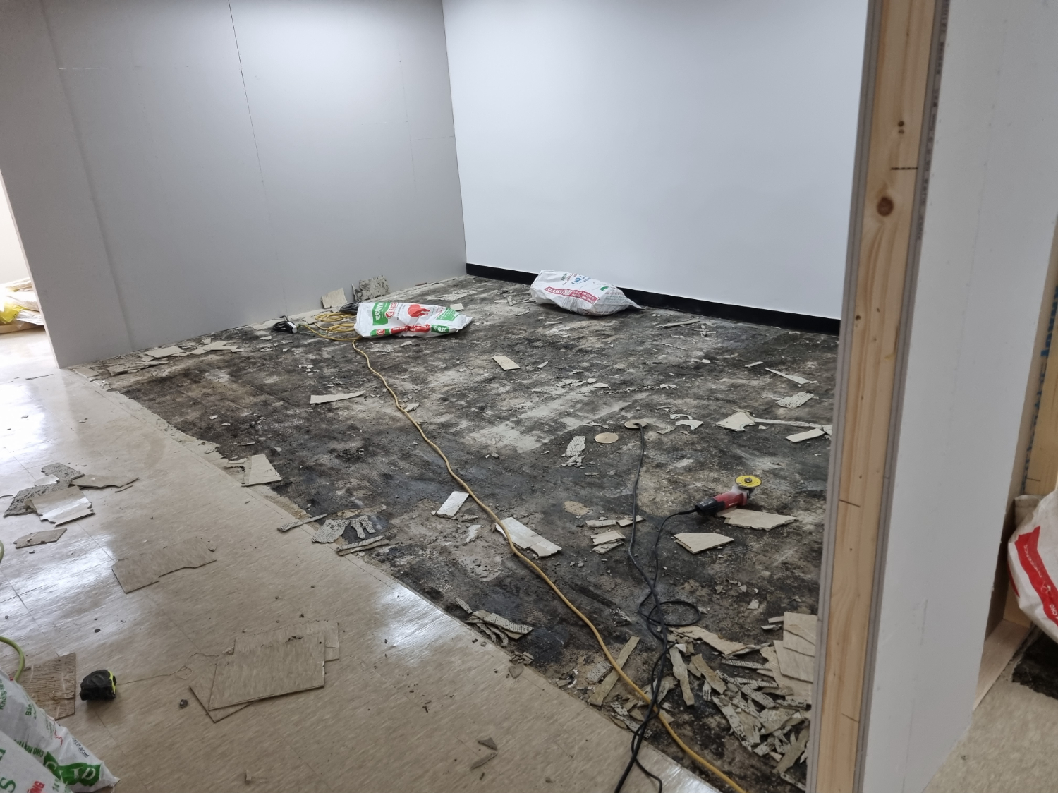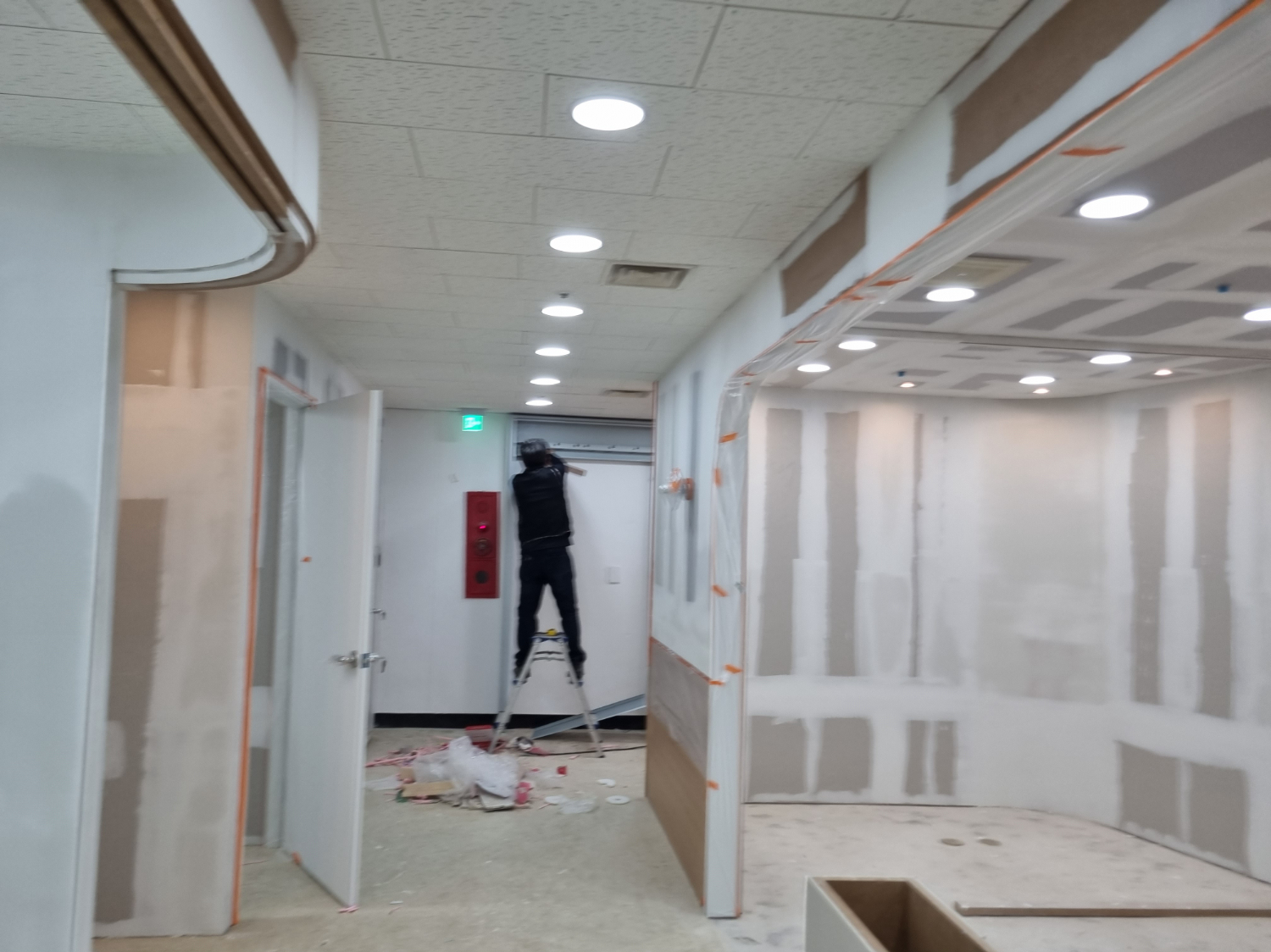하나의 오픈된 공간이었던만큼 먼저 목공 작업으로 뼈대를 만들어 공간을 구분했습니다. 이번 현장처럼 공간을 새롭게 구성하는 경우에는 불편함 없이 안전하게 사용하실 수 있도록 전기나 수도, 소방 관련 시설까지 설계에 맞춰 이전 및 설치까지 진행합니다.