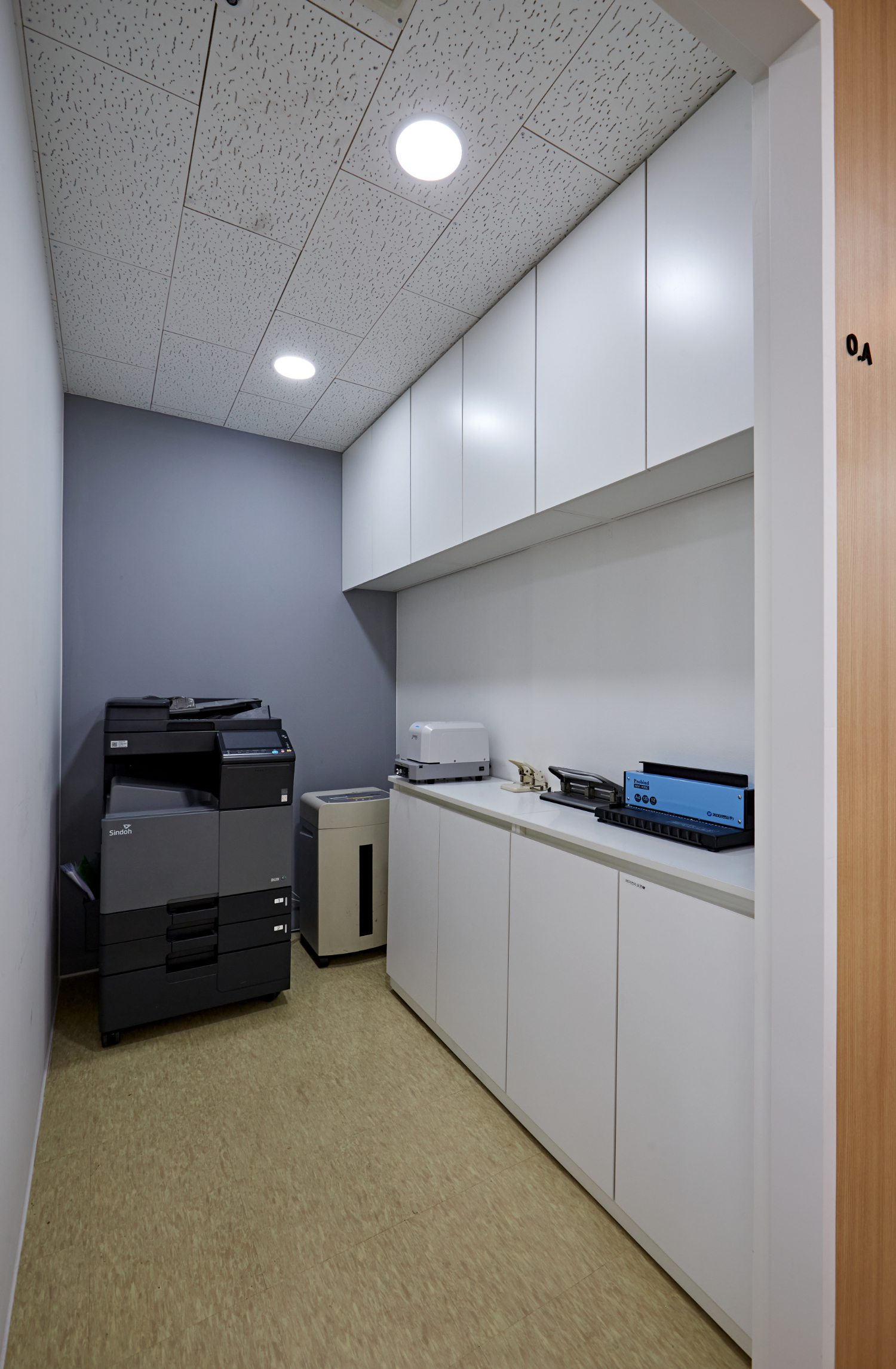 업무 공간은 오픈형 구조이며, 각각의 섹션마다 수납장을 배치해 활용도를 높여주었습니다.