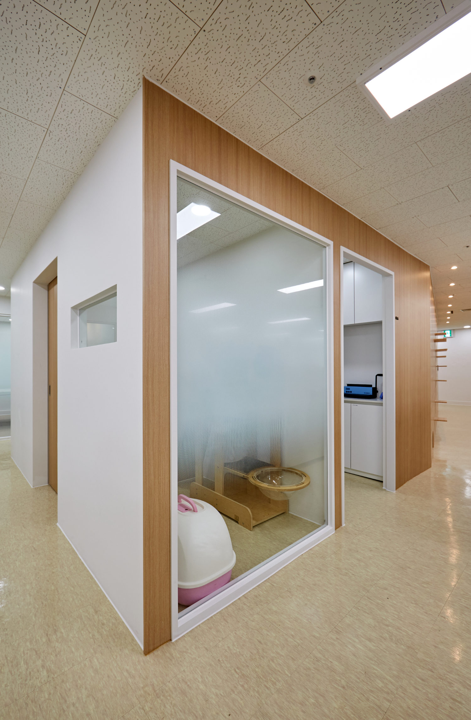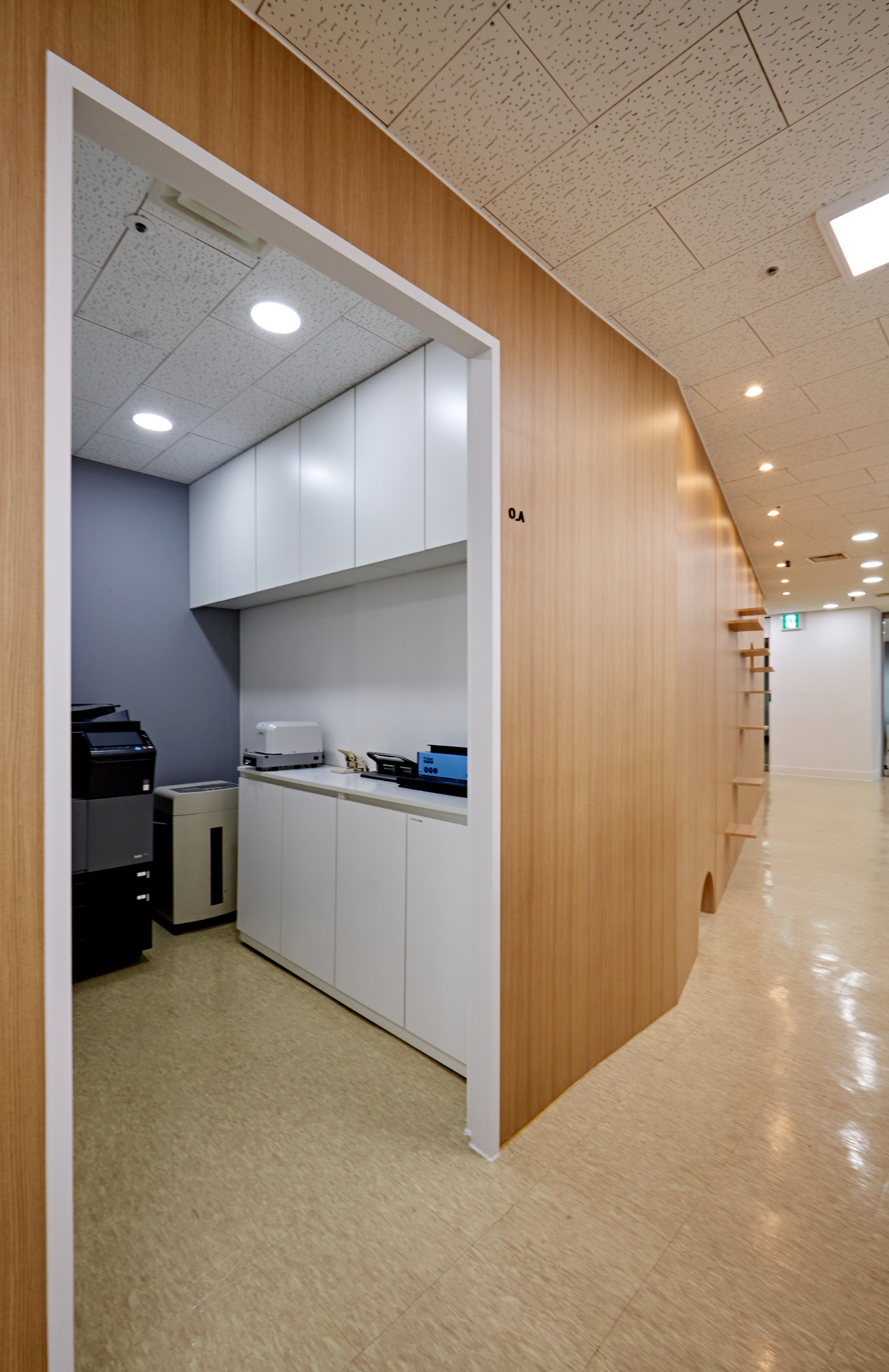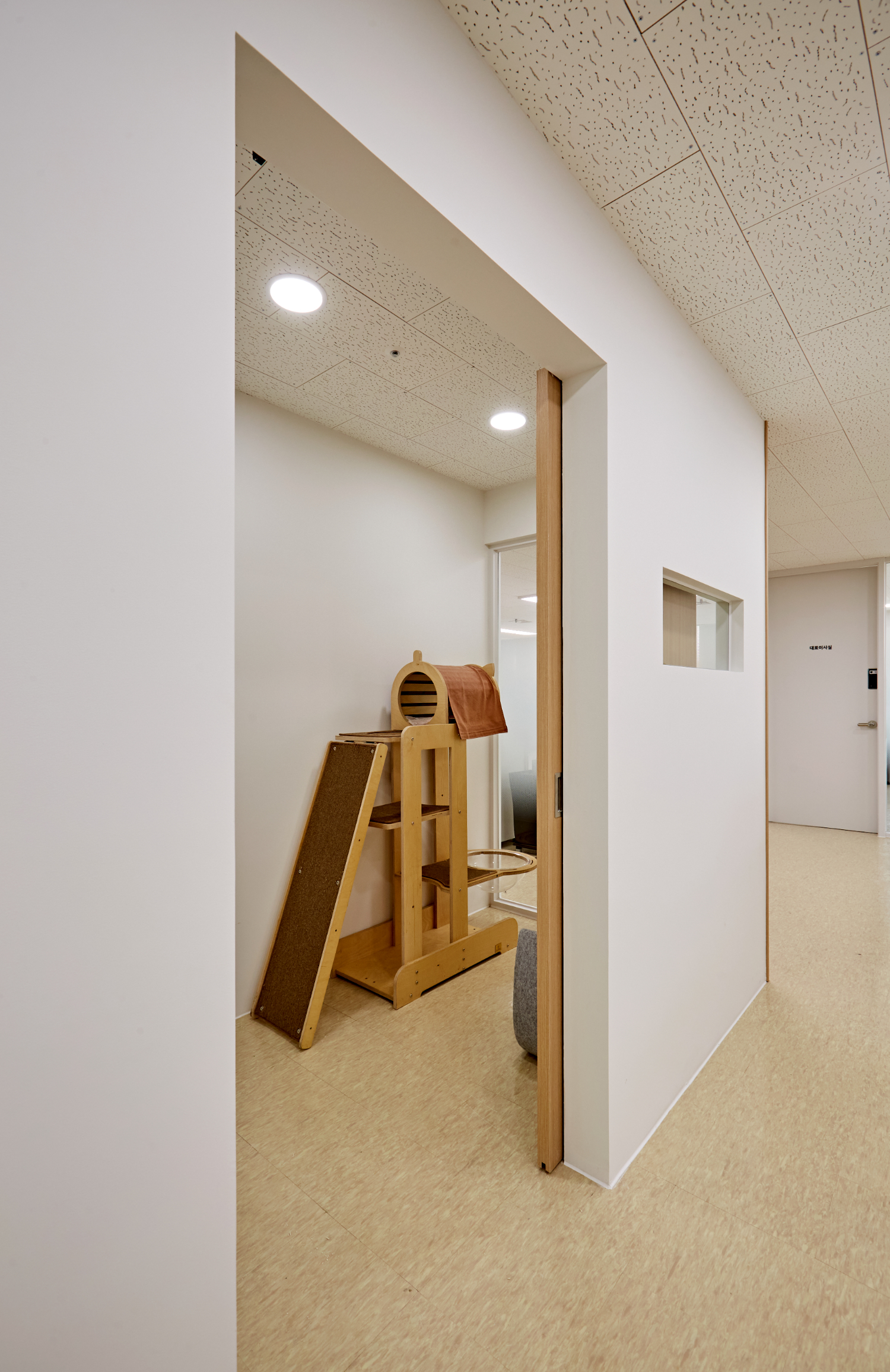 복도를 따라 쭉 들어가면 탕비실과 고양이방이 위치해 있습니다. 고양이실은 슬라이딩 도어를 설치하여 상황에 맞게 사용할 수 있도록 했습니다. 고양이에 대한 애정이 남다르신 클라이언트분이었기에 그 니즈에 맞도록 도와드렸는데요. 이렇게 개인 맞춤형 디자인을 함께 고민해드리기에 더욱 높은 퀄리티의 공간이 완성될 수 있었습니다.