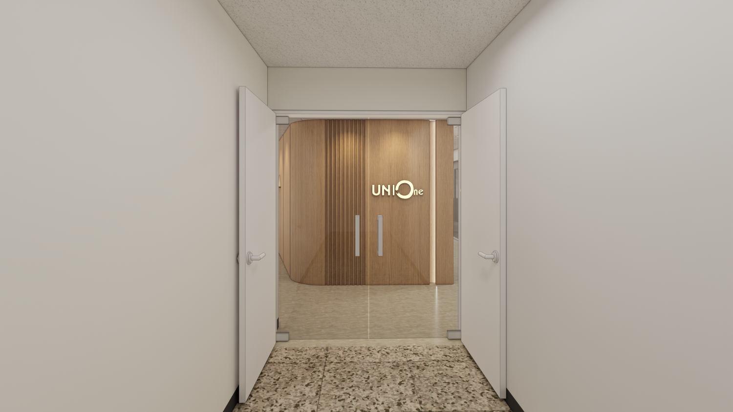 먼저 외부 파사드입니다. 전체적인 컨셉에 맞춰 방화문도 브라운 컬러로 도색했고 출입문은 편리함을 위해 자동문으로 설치 했습니다. 중앙에는 기업 로고를 넣은 시트지를 부착해 깔끔하게 포인트를 주었습니다.