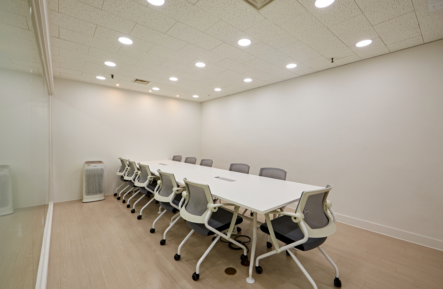 라운지 반대편에 위치한 회의실은 깔끔한 화이트 인테리어가 돋보입니다. 글라스월 중앙에 그라데이션 시트지를 부착하여 개방감과 프라이빗함 두가지 모두 살린 디자인입니다. 또한, 천장에는 다수의 매립등을 설치하여 밝은 공간으로 구성했습니다.