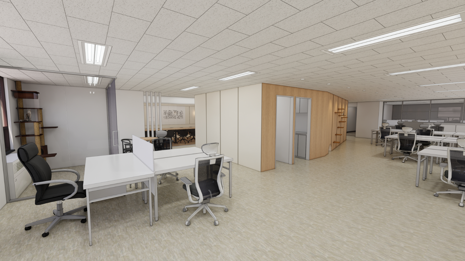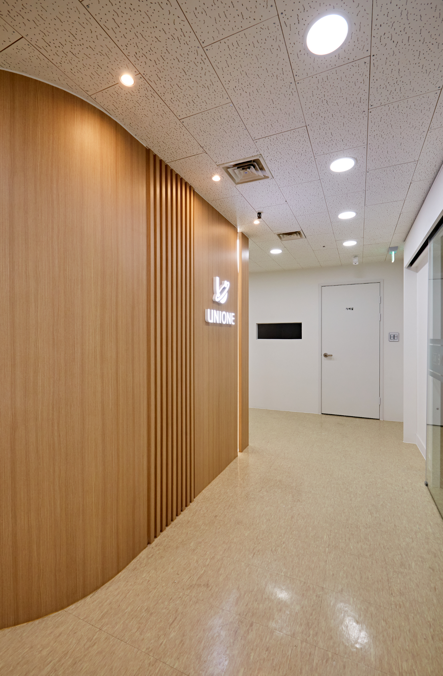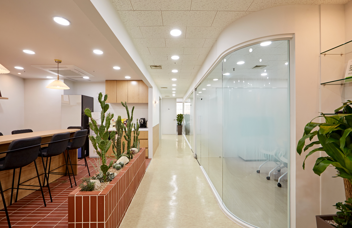 시공했고 회의실은 글라스월로 개방감 있게 만들어 복도가 답답함 없이 탁 트인 느낌입니다.