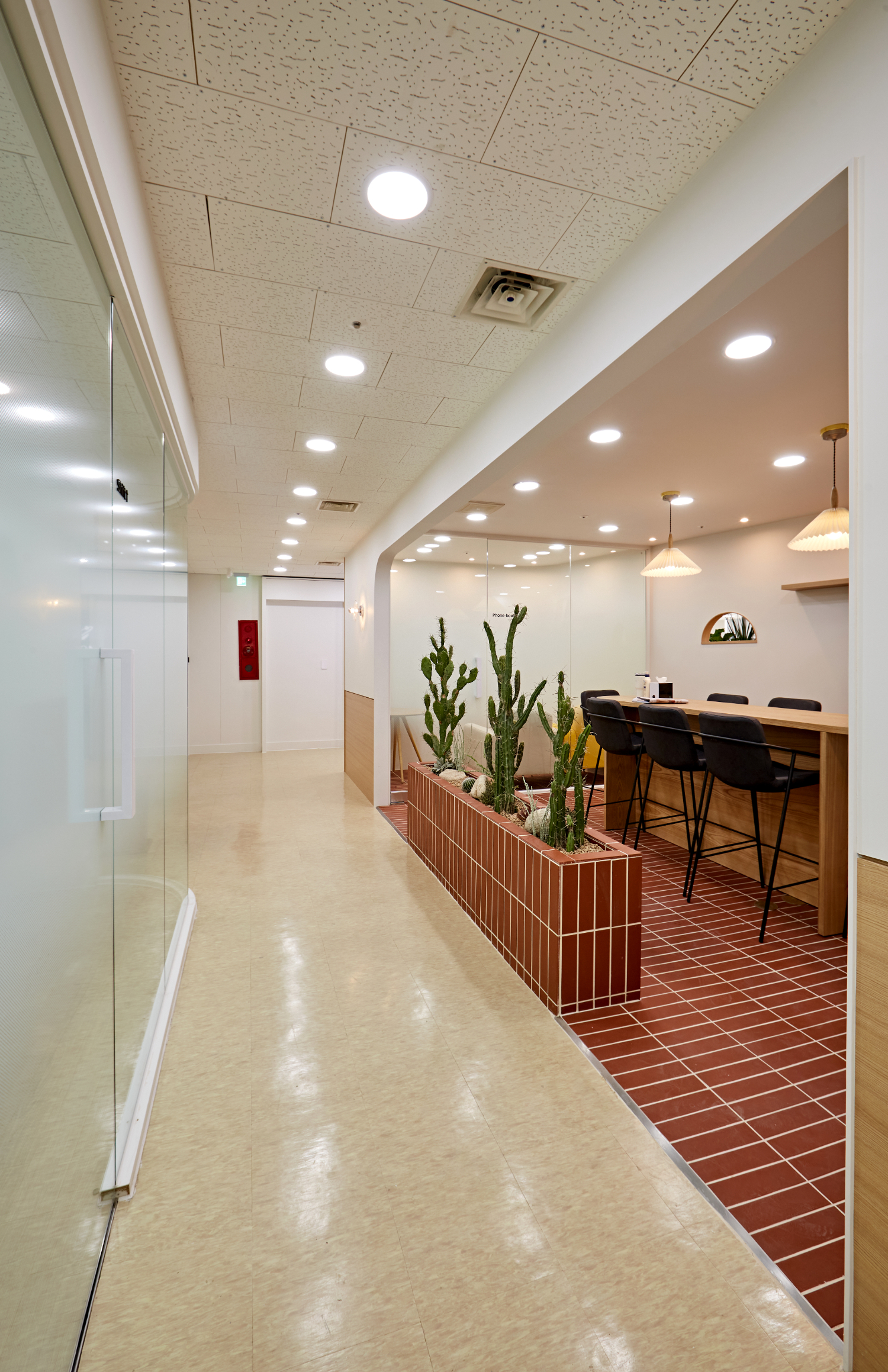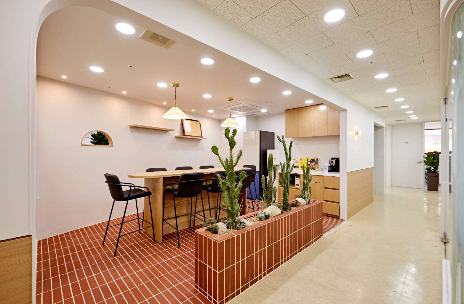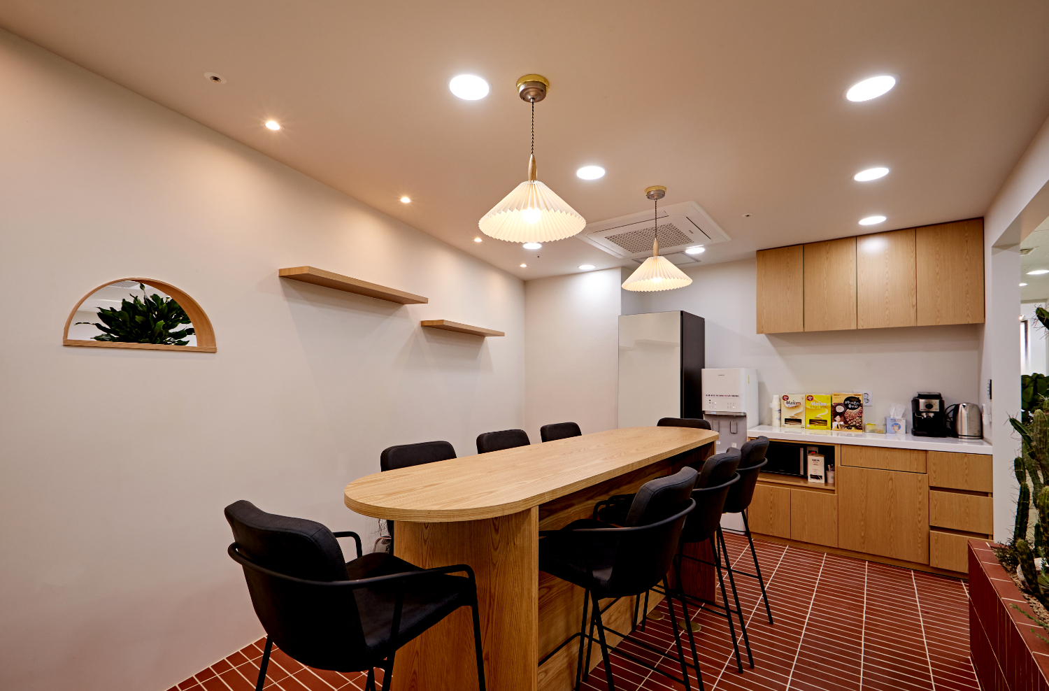 벽돌색 타일 마감재를 사용하여 전체적으로 밝고 자유로운 분위기를 연출했습니다. 라운지 안쪽으로는 수납장과 냉장고 등을 넣어 공간 효율성도 높였는데요. 전체적으로 젊은 무드를 내는 곳이었기에 이렇게 탕비실의 색감도 신경쓰고 팬던트 조명도 더욱 멋스러운 아이템으로 배치하였습니다.