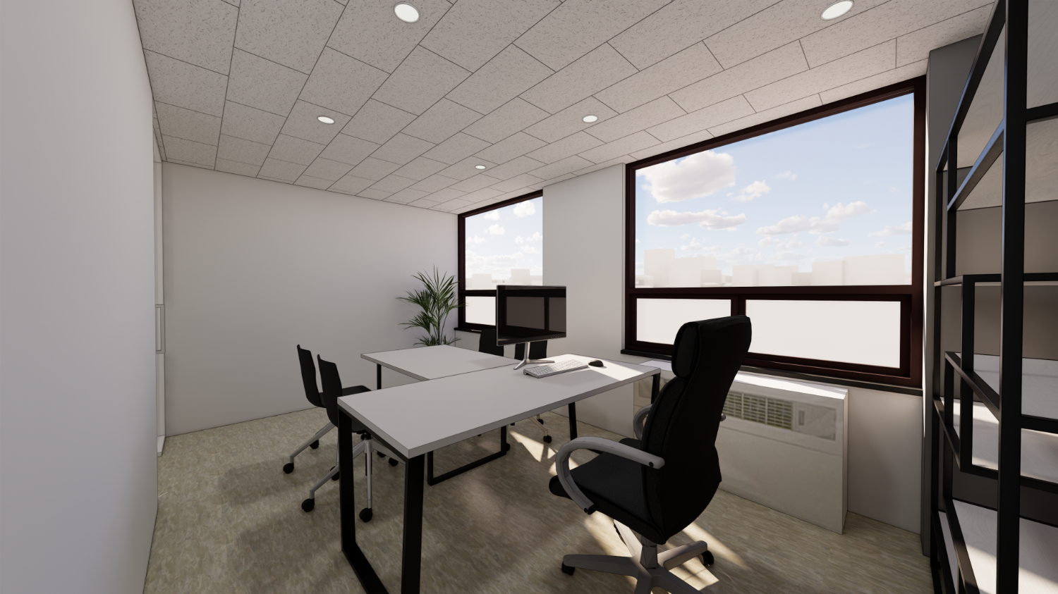 화이트 인테리어가 돋보이는 대표실 3D디자인 시안입니다. 블랙 프레임의 가구들을 사용하여 포인트를 주고 중앙에는 간단한 미팅을 할 수 있도록 테이블을 배치했습니다.