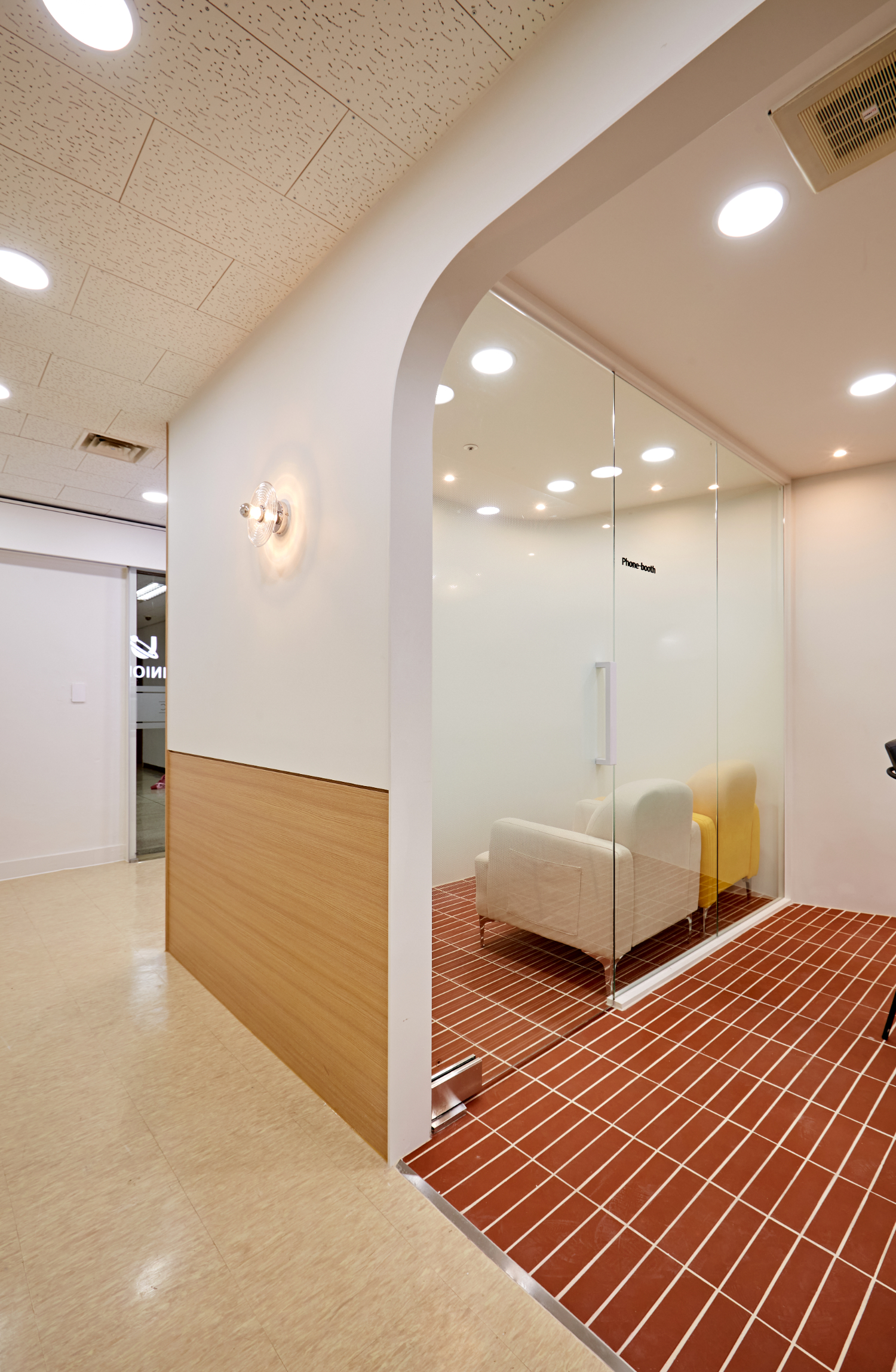 다음으로 살펴볼 공간은 폰부스입니다. 폰부스는 최근 사무실인테리어에서 많이 시공하고 있는데요. 라운드 옆쪽에 위치해 있어 동일한 바닥 마감재를 사용하였으며 쇼파와 테이블을 배치해 편안한 공간으로 만들었습니다.