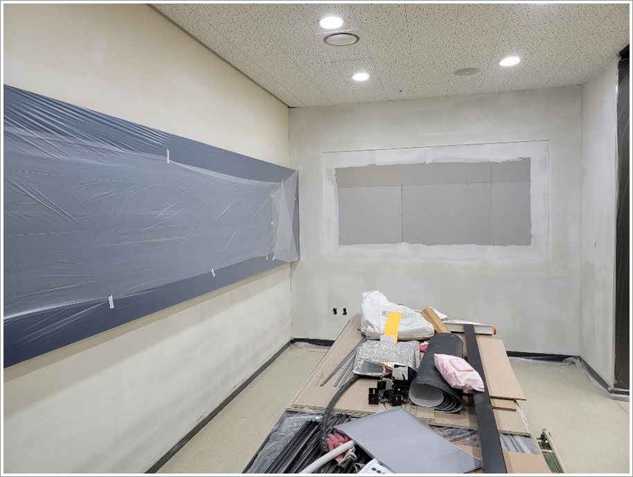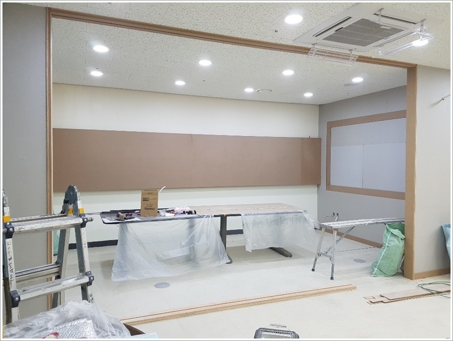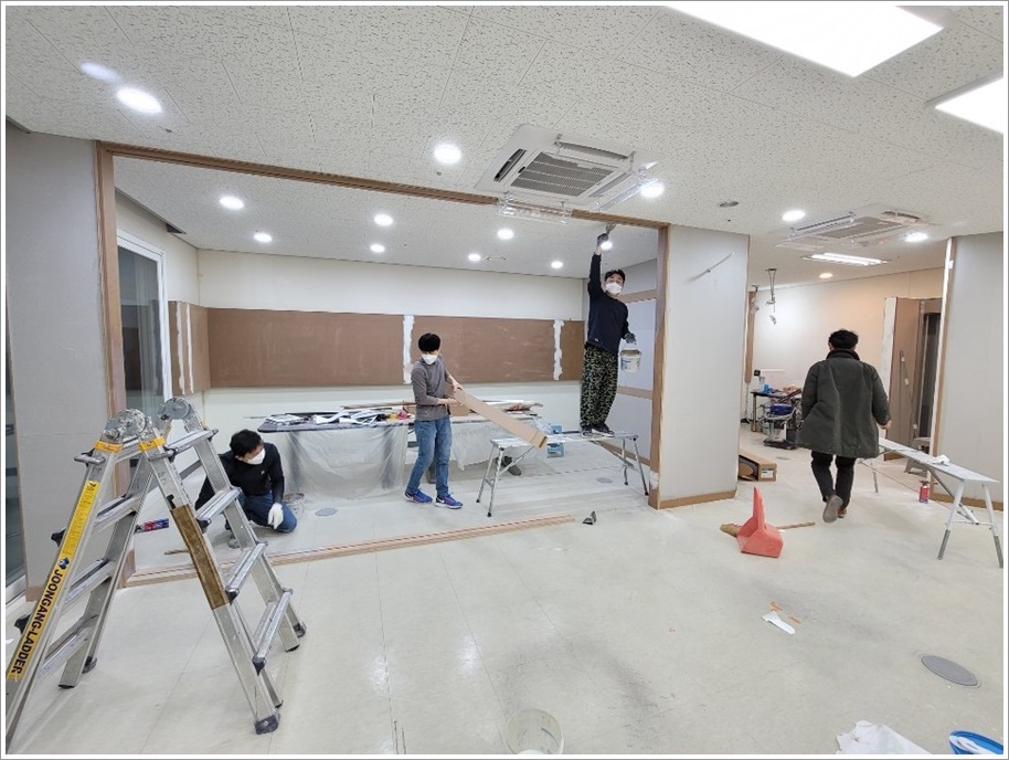 철거가 끝나면 사무실 배치와 동선이 계획된 레이아웃에 따라 가벽을 설치해 공간을 나누는 구조 시공을 목공 작업으로 진행합니다. 목공 작업 후에는 타일, 도장, 필름, 벽돌 등의 마감작업이 들어가는데 어떤 자재를 사용하는가에 따라 공간의 분위기가 달라지고 연출 컨셉트에도 영향을 줄 수 있기 때문에 디자인에 맞는 적절한 시공법을 결정해야 합니다.
