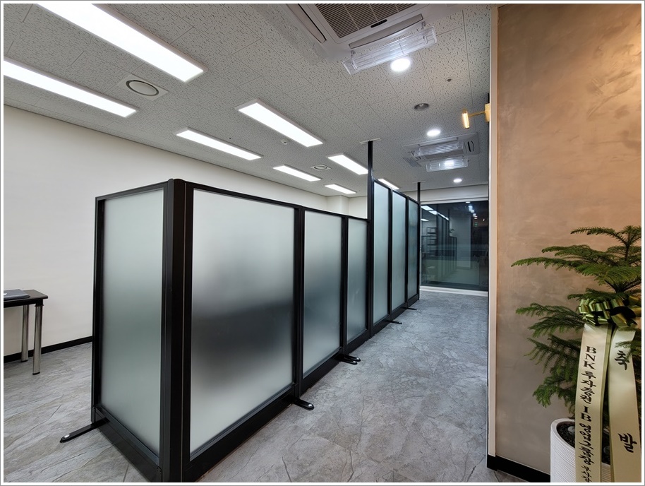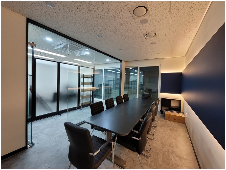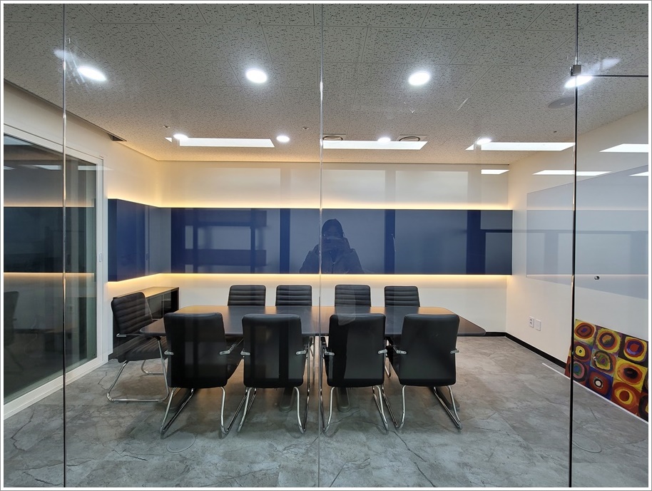 유리 가벽을 세우기 위해 프레임을 작업한 후 필름지로 마감을 한 회의실 모습입니다. 유리만 적용했을 때 약간 밋밋할 수 있는 디자인에 블랙 프레임을 더해 세련되고 깔끔한 분위기를 조성했습니다.