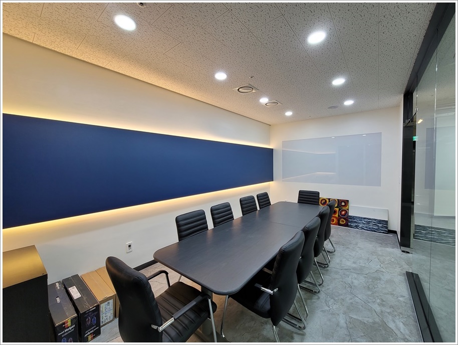 유리 가벽으로 공간을 독립적으로 구분한 회의실입니다. 내부 벽면에는 차분한듯 하면서 경쾌하고 자신감있는 딥블루를 디자인해 입구 파사드와 인테리어적 통일성을 주었고 가로로 길게 디자인하고 간접 조명을 시공해 공간이 더욱 길고 넓어 보이는 효과를 주었으며 차가울 수 있는 딥블루에 따뜻한 색의 조명을 적용해 고급스럽고 아늑한 분위기를 연출했습니다.