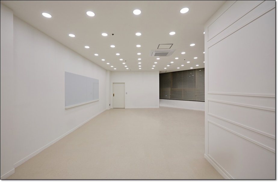 통합형으로 계획해 다양한 공간 활용을 할 수 있는 공용 사무실입니다. 전체적으로 화이트와 아이보리 컬러로 마감해 깔끔하면서 따뜻한 분위기로 조성했고 매립형 조명을 시공해 어두운 곳 없이 밝은 조도를 확보하도록 했습니다. 확장성을 가진 화이트 계열의 컬러에 밝은 조명이 더해지면서 공간이 더욱 넓고 화사해 보며 쾌적하게 근무할 수 있는데요, 벽면에 화이트 보드를 시공해 사용성과 편의성을 높였습니다.