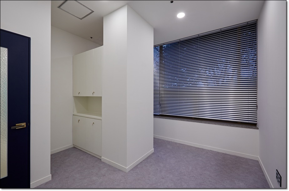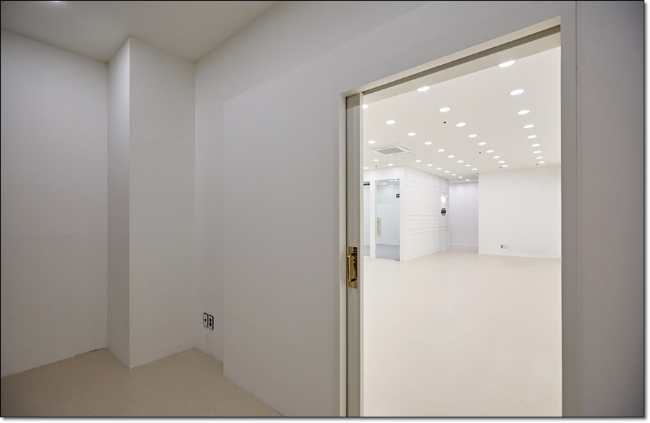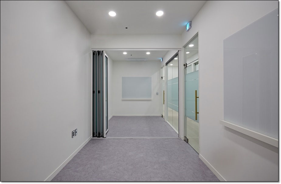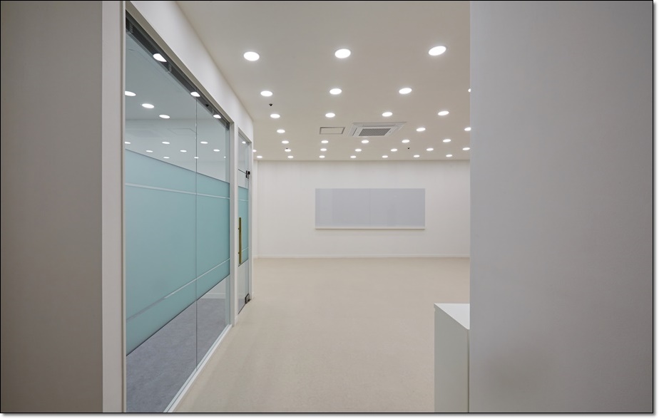 대표실, 회의실, 임원실은 가벽을 세워 개별 사무실로 시공함으로써 만들어진 복도를 통해 내부로 이동하는 동선을 설정했고 복도는 중앙의 독립 사무실 뒤로 이어지면서 전체를 순환할 수 있는 동선이 되면서 동시에 휴게 공간이 되었습니다. 각각의 개별 사무실은 유리 가벽을 적용해 개방감을 줌으로써 답답함을 해소했고 복도와 사무실 내부의 조명의 빛번짐이 서로 보완되면서 필요한 조도를 확보하게 했습니다.