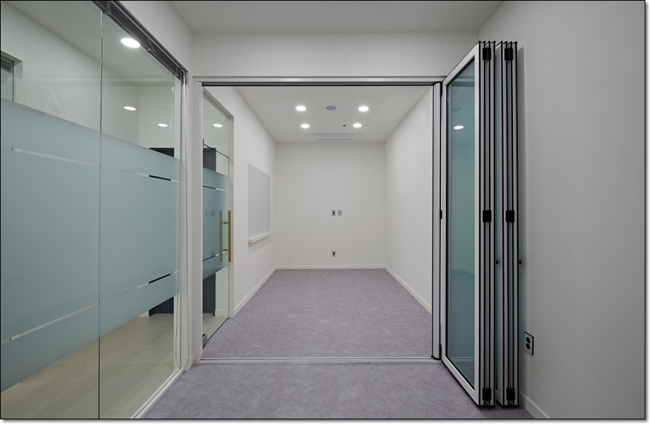 회의실 또한 개별 공간으로 분리했는데요, 가운데에 폴딩도어를 달아 공간을 통합하거나 분리해서 사용할 수 있도록 했습니다. 폴딩도어는 옆으로 접고 펴는 방식을 통해 문을 열고 닫을 수 있는도어로 모두 열면 90% 이상의 개폐율을 확보할 수 있어 다양한 시설에 시공되고 있답니다. 이 곳에서는 폴딩도어를 열면 대형 회의실로 사용할 수 있고 도어를 닫으면 중형 및 소형 회의실로 사용할 수 있어 그에 따른 에너지 절약도 할 수 있답니다.