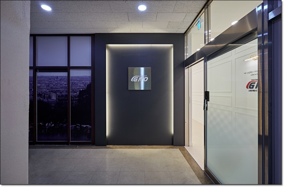 외벽과 유리 가벽을 활용한 사무실 외부 파사드입니다. 진입하면서 보이는 정면에 해당하는 외측 벽면에는 로고와 업체명을 디자인한 간판을 시공하고 도어로는 내부에 시공된 로고와 업체명을 보이도록 해 인지성과 가독성을 높였습니다.