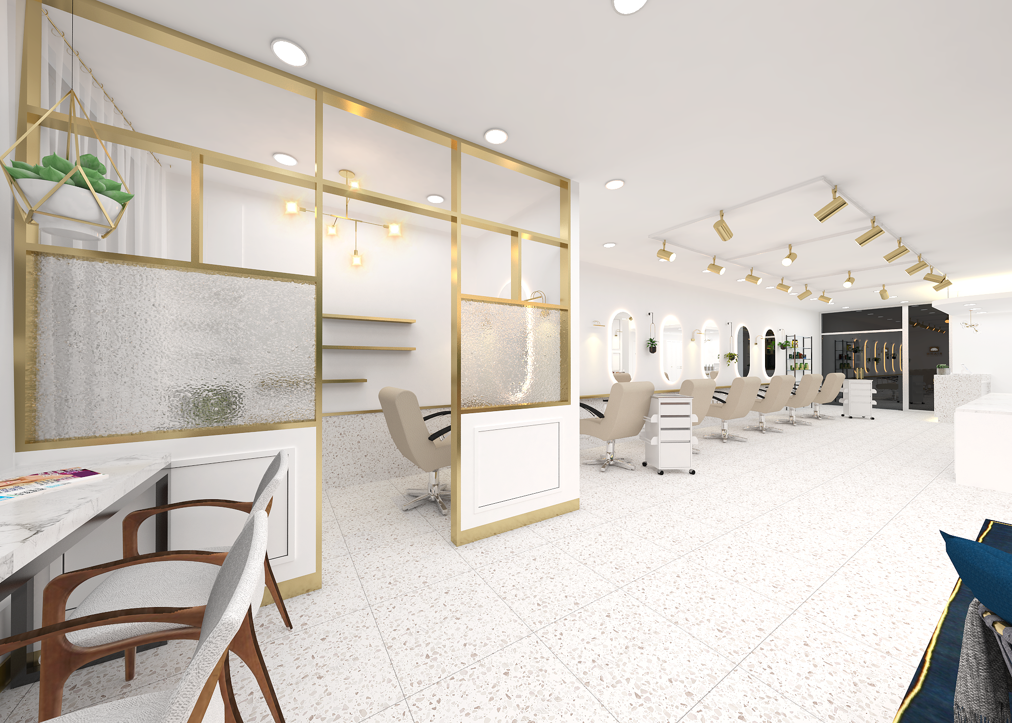 특히, 공간 위 직사각형 골드 프레임의 팬던트 조명은 공간의 독창성 및 미용실의 아이덴티티가 될 수 있을 것으로 기대하고 있습니다.