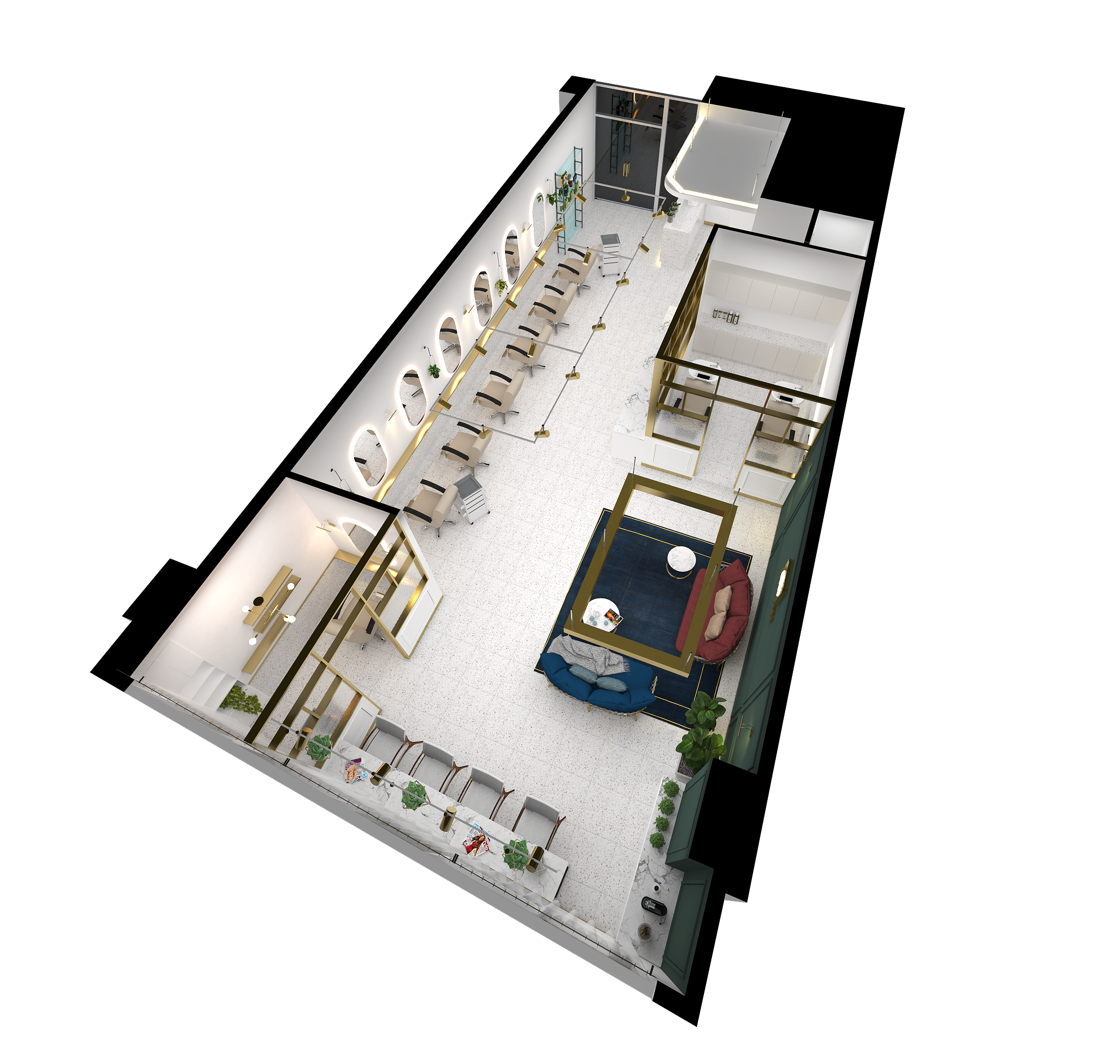 이 과정은 고객님의 이해를 돕는 단계로 2D 도면일 때 체크하지 못했던 수정 보완을 3D 이미지에서 발견할 수 있어 최종 시안이 나오는데 굉장히 도움이 되는 작업입니다. 이번 제안은 직사각형의 공간에 경대공간, 샴푸공간, 대기공간, 중화공간, 스태프 공간을 구성한 계획으로 쾌적하면서 고급스러운 분위기를 연출할 수 있도록 디자인했습니다.