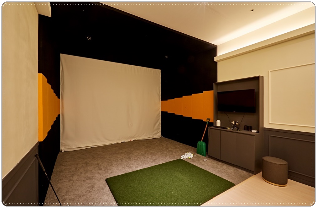 스크린룸 내부입니다. 1:1 맞춤 레슨이 이뤄지는 공간으로 크림색과 브라운을 매치해 답답하지 않으면서 고급스러운 분위기로 조성했습니다. 스크린이 설치되는 공간은 원근감을 느낄 수 있는 디자인을 적용했고 공이 튀어나오는 것을 대비한 안전장치를 시공해 안전하게 이용할 수 있도록 했습니다.