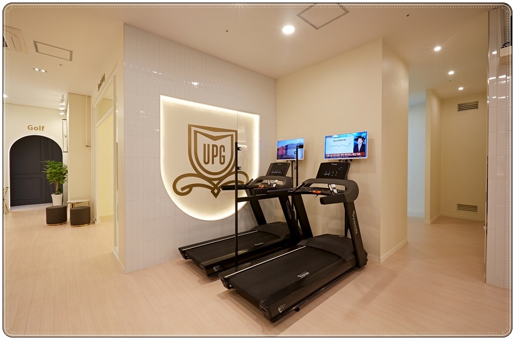 유산소 운동을 할 수 있는 런닝 머신이 있는 공간입니다. 벽면에 로고를 사인물로 시공하면 센터의 정체성과 가독성을 높일 수 있는데요, 벽면을 타공해 단차를 주고 간접조명을 심으면 이천 용인 수지 스크린골프장&헬스장인테리어로 추천할만한 고급스러운 디자인 연출이 가능하죠. 기둥과 내력벽엔 유광타일을 시공해 조명이 반사돼 공간이 더욱 화사해보이도록 의도했습니다.