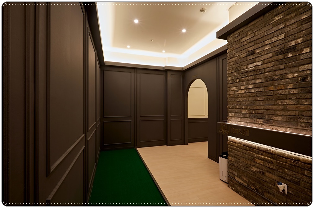 스크린 골프를 할 수 있는 골프 영역은 아치형 출입구를 따로 두어 트레이닝 영역과 완벽하게 구분했습니다. 골프영역은 고급스러운 진한 컬러로 마감을 했고 각 스크린룸은 가벽을 세워 개별 공간으로 조성했으며 가벽을 세워 생긴 복도라인으로 이동하도록 동선을 유도했습니다. 타일로 마감한 헬스장 기둥과 달리 골프 영역의 기둥은 파벽돌로 마감해 고풍스러운 분위기를 줬으며 골드 메탈 벽부등을 시공해 고급스러움을 극대화했습니다.