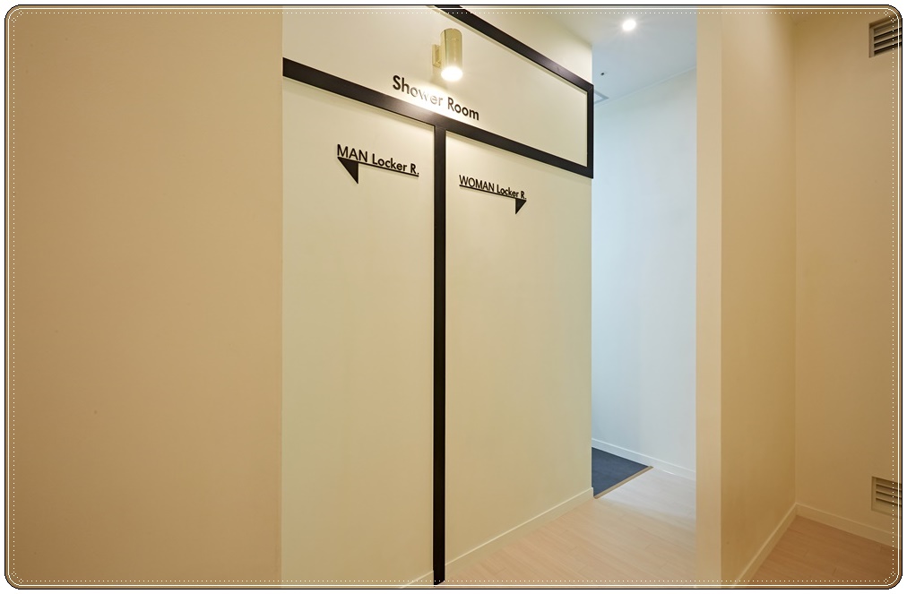 트레이닝 영역에 있는 탈의실 & 샤워실은 크림색 복도라인을 따라 이동하면 쉽게 찾을 수 있습니다. 당연히 남여 구분해 배치했고 사인물을 시공해 가독성을 높였습니다. 탈의실 내부는 깔끔하고 청결함을 강조한 화이트로 시공했고 거울을 부착해 공간이 넓어 보이도록 했으며 물에 강한 바닥재를 적용했습니다.