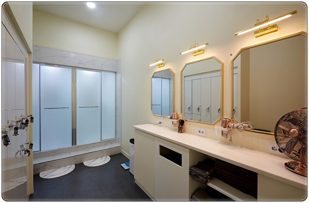 최근 프라이버시 확보를 위해 피트니스 인테리어에 많이 시공되고 있는 개별 샤워룸입니다. 이천 용인 수지 스크린골프장&헬스장인테리어를 할 때 고급스러운 디자인 연출!을 위해 추천드리고 싶은 요소입니다. 한 번 시공하면 오랜 기간 운영하는 피트니스 인테리어는 업종의 트렌드를 담으면서 유행 디자인을 적용하는 것이 중요합니다.