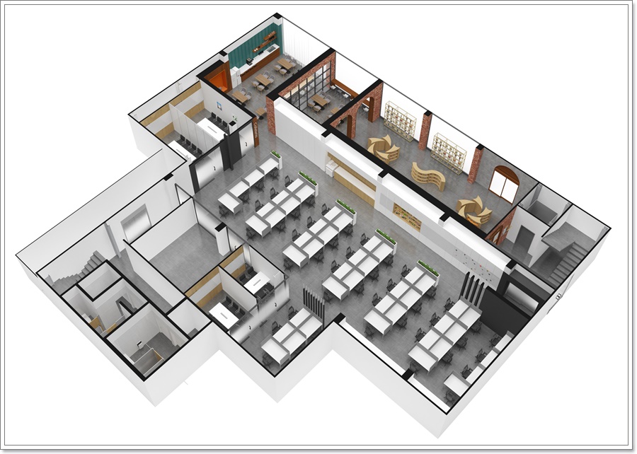 위에서 본 3D 의 모습을 보면서 소개해드리겠습니다. 전체적으로 화이트톤의 외벽과 그레이톤의 바닥으로 디자인 하여서 깔끔한 느낌으로 구성한 사무일 인테리어입니다. 또한 부서마다 포인트 컬러를 통해 부서의 색깔을 녹여보았으며 잘못하면 촌스럽게 보일 수 있는 벽돌 외벽 같은 경우에는 구석구석 포인트 디자인으로 넣어서 현대적인 느낌을 만들어 보았습니다.