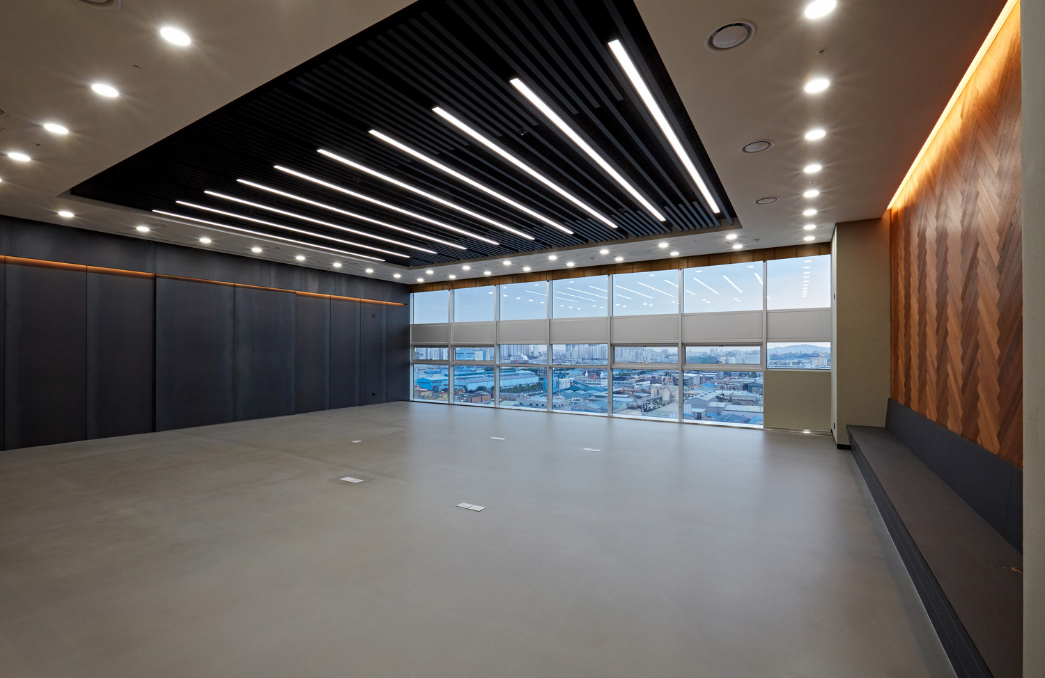 전체 회의실로 활용 될 이 공간은 한쪽면이 전부 통창으로 되어 있어 개방감을 주는데요. 또한 천장 중앙에는 라인 조명이 촘촘하게 설계되어있고 방 전체를 아우르는 테두리에도 원형 조명들이 설치되어있습니다. 그리고 헤링본우드로 고급스러우면서도 클래식한 멋을 내주고 회의가 진행될때는 천장에서 프로젝터 화면과 블라인드가 내려오면서 집중도를 높여줍니다.