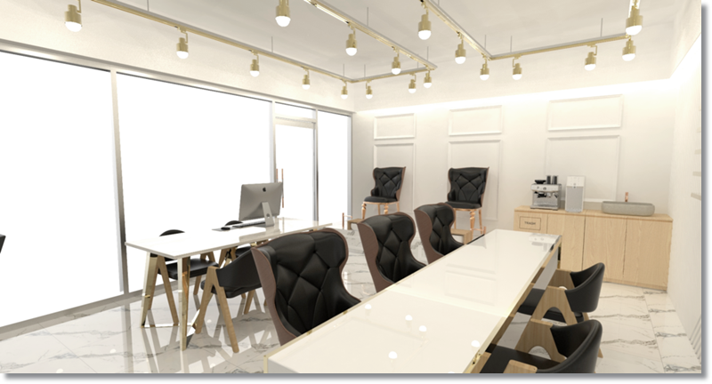 실내의 모습입니다. 작업대와 테이블 같은 경우에는 3개의 의자와 1개의 테이블을 배치하여서 총 3명의 고객이 작업을 받을 수있도록 구성하였습니다. 또한 작업자와 고객의 거리가 너무 가깝지 않게 그렇다고 작업에 지장이 갈정도로 멀지도 않게 배치를 하였고 베이직 톤 벽에 사선 무의를 넣음 으로서 공간이 최대한 넓고 길어보일 수 있도록 인테리어를 해보았습니다.