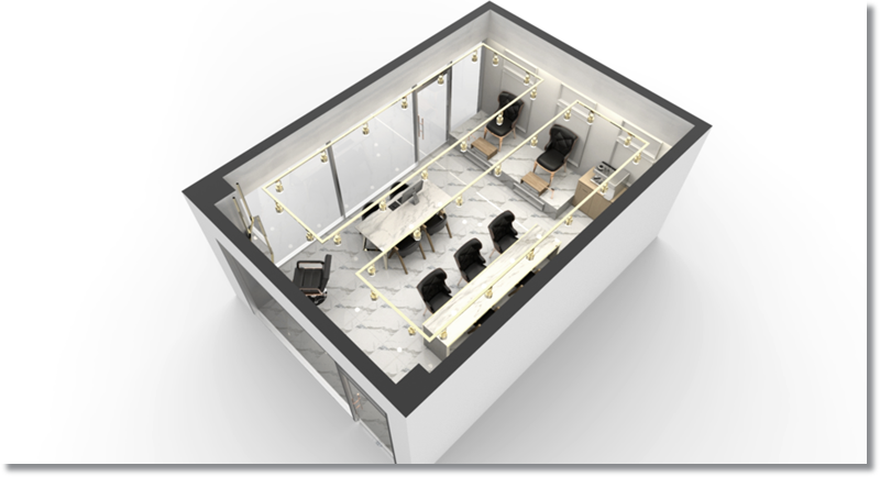 네일샵의 끝에는 발 케어를 받으실 수 있게 2의자 2개를 배치하였으며 의자의 아래에는 무대처럼 층을 놓여서 고객이 조금더 편안하게 대기를 하거나 작업을 받을 수 있게 인테리어 하였습니다. 특히 작업을 받을 시에는 상대적으로 내려다 보는 느낌이 들게하여 손님이 왕이라는 분위기를 내주기도 하였습니다. 의자의 등부분이 붙어있는 외벽에는 몰딩처리를 해서 고급스러움을 챙겼습니다.