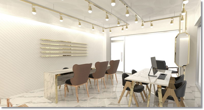 작업대 같은 경우도 고객이 편안하게 네일 작업을 받을수 있도록 배치하였으며 테이블은 베이직 톤의 대리석 책상을 배치하여서 고급스러움을 추가하였습니다. 의자 같은 경우에도 데스크에 있는 의자와는 다르게 작업을 받는 고객 전용 의자로 한층 더 쿠션감이 있는 의자 3개를 배치하였고 고객이 바라보는 외벽에는 인테리어를 설치하여서 중요포인트를 높였습니다.