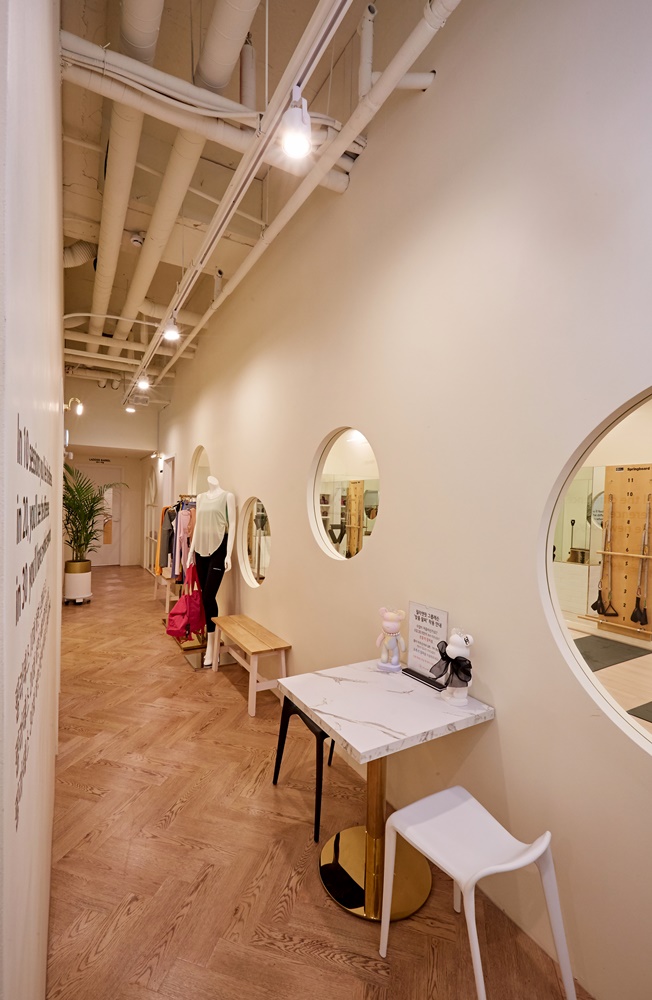 필라테스 영역은 헬스장과 대비되는 화이트로 마감해 영역성을 명확히 했고 종목의 특성상 독립된 공간에서 운동을 진행해야 하기 때문에 각 기구별로 공간을 구획해 가벽을 세워 룸을 분리했습니다. 기구별로 공간을 분리하는 벽은 유리를 적용하고 용품을 판매하는 곳과 분리하는 벽은 합판을 적용했고 합판 가벽에는 원형 창문을 뚫어 답답함을 해소했습니다.