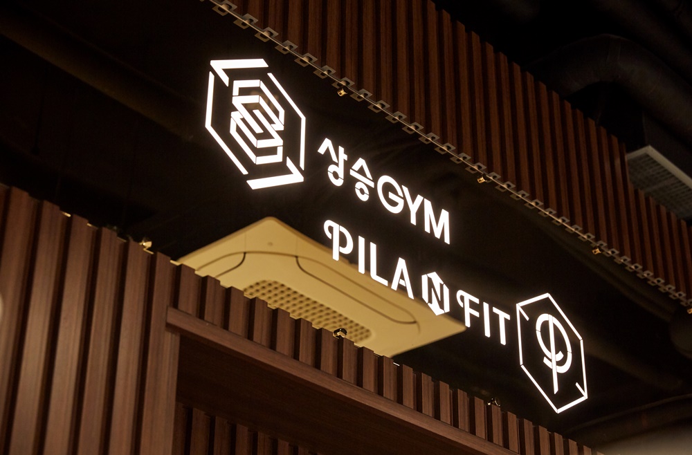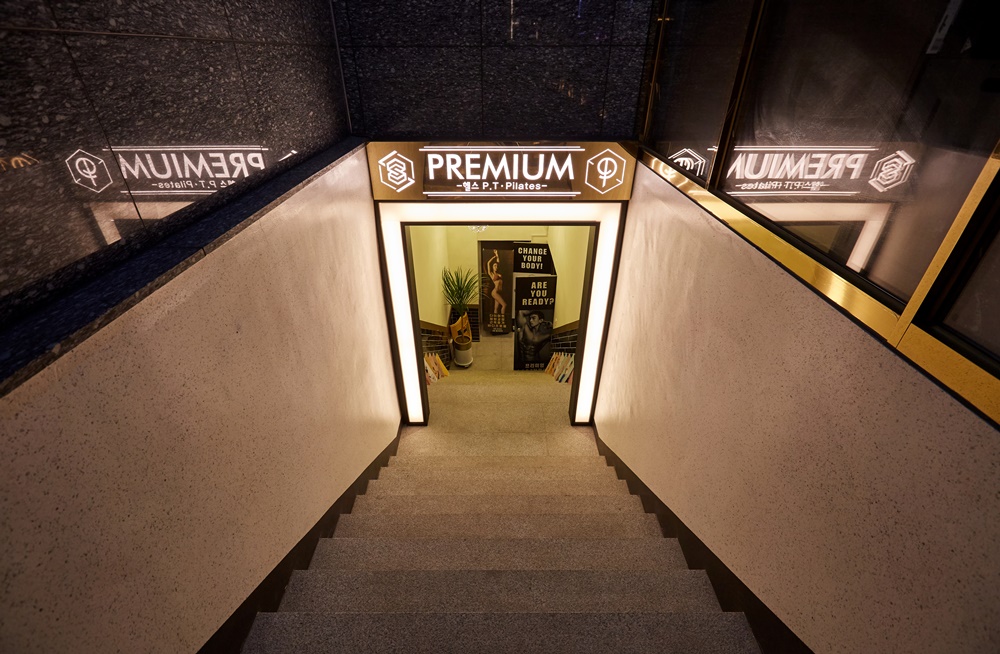 오늘 소개해드릴 현장은 헬스장과 필라테스를 함께 운영하는 곳으로 지하에 위치해 있는 실내 운동시설입니다. 그래서 입구 파사드에 디자인을 줘 큰 강조를 해주는 대신 화이트 조명으로 시원하고 깔끔한 느낌을 주었고 골드 컬러의 금속 간판으로 고급스러우면서 모던한 디자인을 구현했습니다.