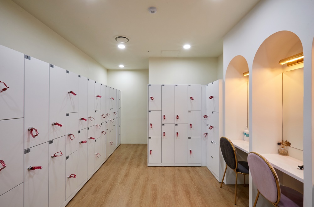 너무 어두운 분위기보다는 편안한 분위기를 만들기 위해 인포메이션이 있는 영역은 진한 컬러를 적용하고 라커가 있는 반대 영역은 화이트과 거울 느낌의 금속을 적용해 공간이 밝고 넓어 보이는 효과를 주었습니다.