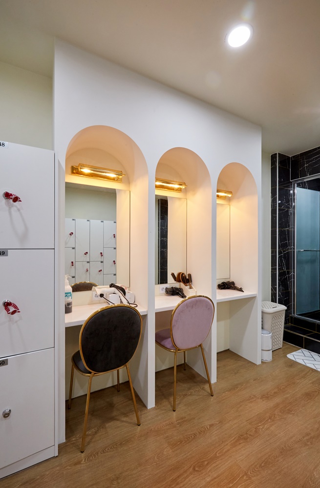 탈의실 & 샤워실은 회원들의 선택에 큰 영향을 미치는 시설 중 하나로 위생적이면서 쾌적한 느낌이 들어야 하므로 최대한 깔끔하게 화이트와 원목을 적용했습니다. 파우더 공간은 사이즈가 큰 거울을 부작하고 개별로 사용할 수 있도록 칸막이 시공을 했으며 웜톤의 조명을 시공해 더욱 화사하게 보이도록 배려했습니다.