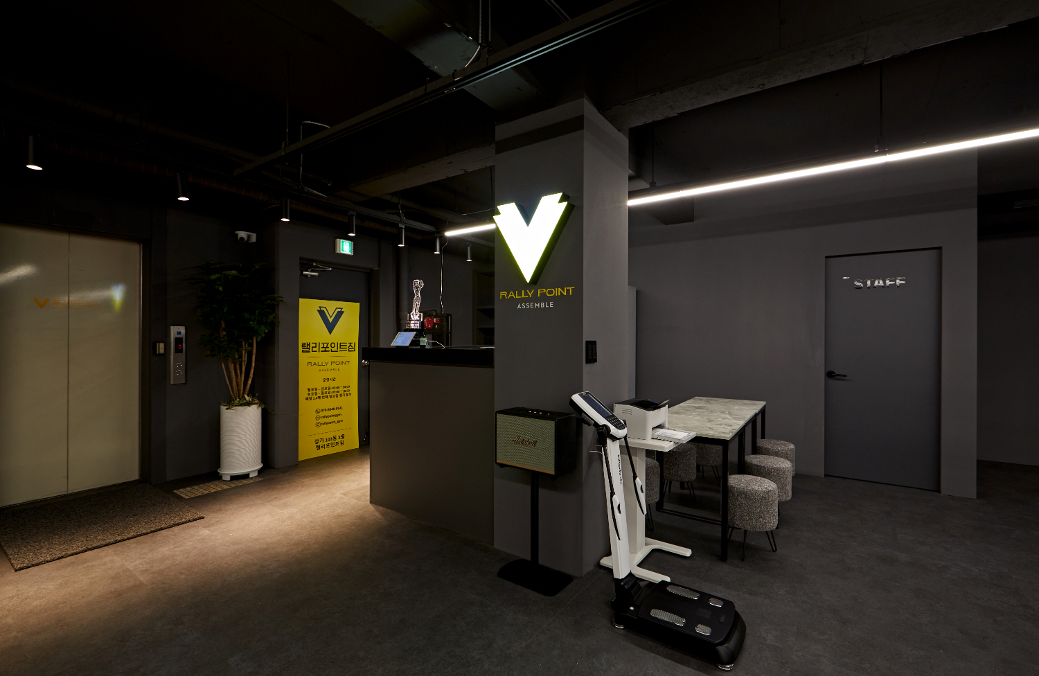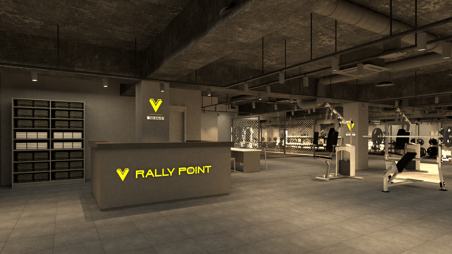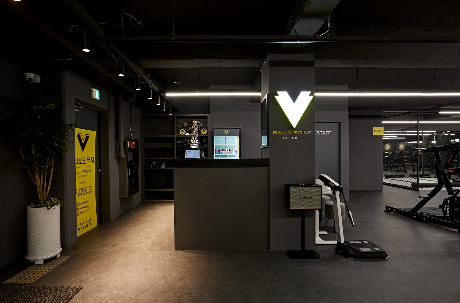 청주 세종 대전 헬스장인테리어의 카운터부터 동선을 따라 쭉 살펴보겠습니다. 어두운 그레이톤의 도장으로 전체가 마감되었으며 곳곳에 조명으로 포인트를 주었는데요. 이번 헬스장의 포인트가 되는 더블브이 로고 조명이 눈에 확연하게 띄고 있습니다. 그리고 천장에는 길다란 라인 조명으로 공간의 연속성을 강조하고 있습니다.