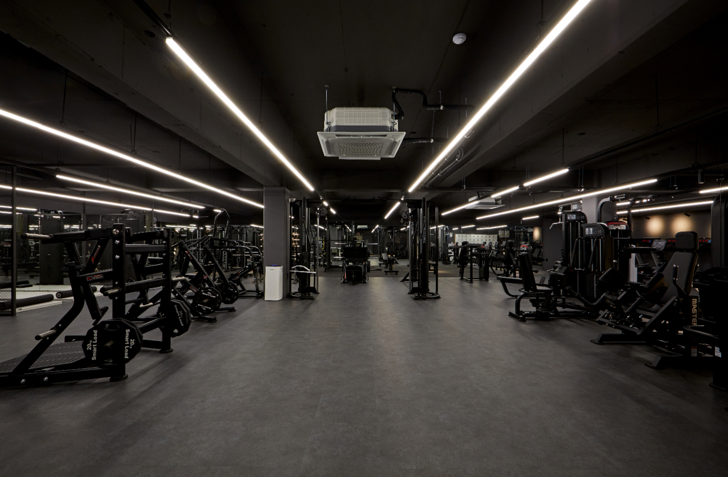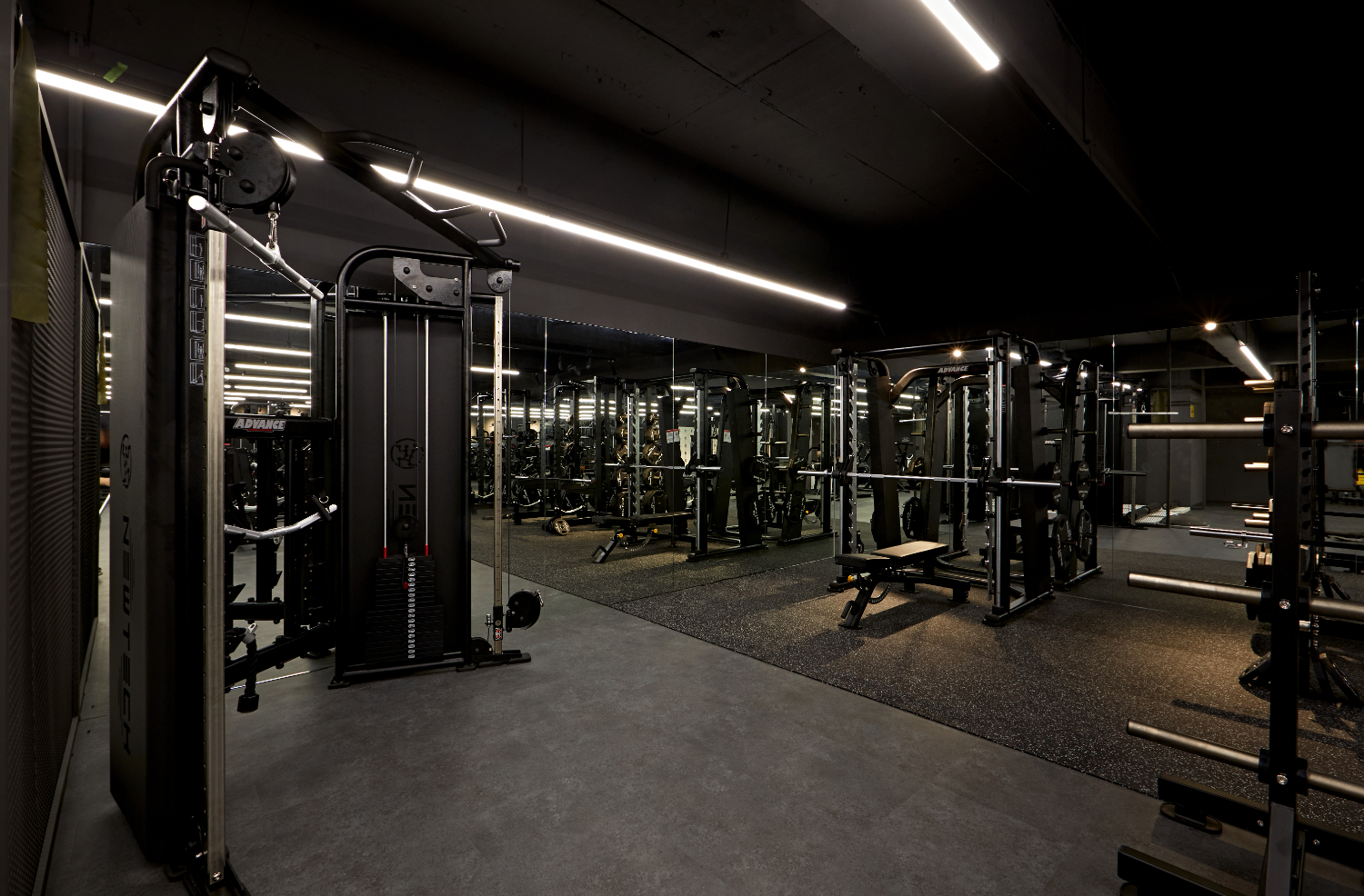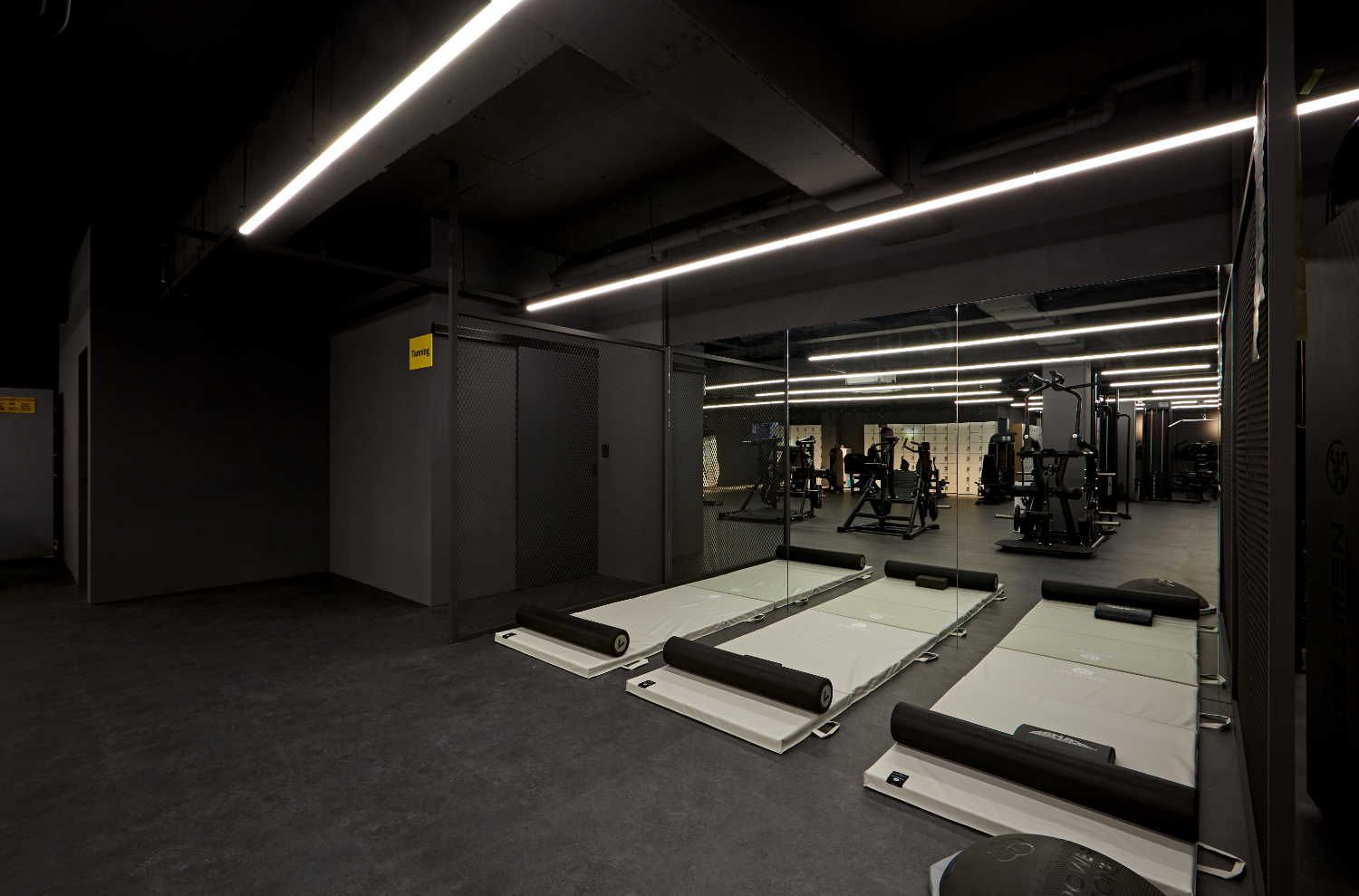 라인 조명을 길게 따라서 시야를 옮기면 메인 운동 공간이 나오는데요. 이렇게 라인 조명을 활용하면 천장이 더욱 트여보이면서 공간이 넓어보이고 개방성을 높일 수 있습니다. 노출 천장으로 시공된만큼 천고가 높고 답답한 느낌을 줄여줄 수 있는데요. 바닥도 시멘트 질감이 느껴지는 그레이톤으로 전체 통일하여 세련되면서도 시크한 매력을 뽐내고 있습니다.