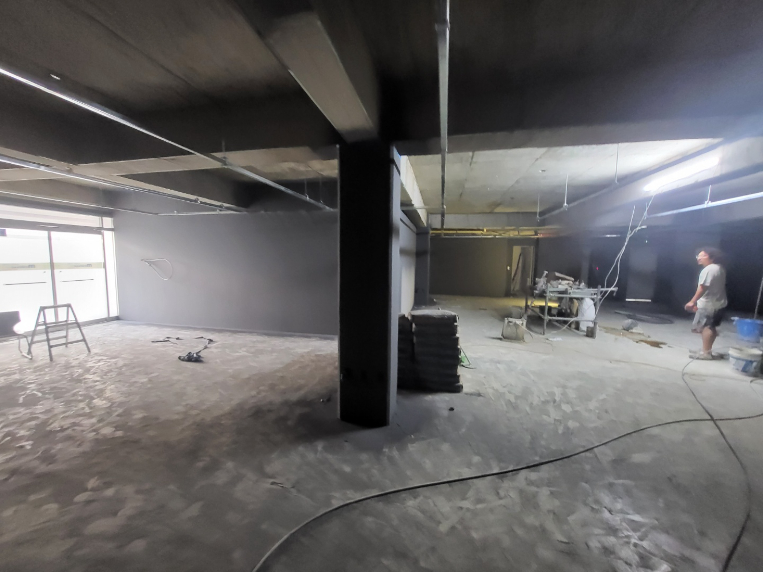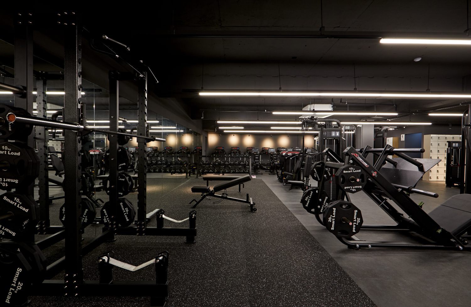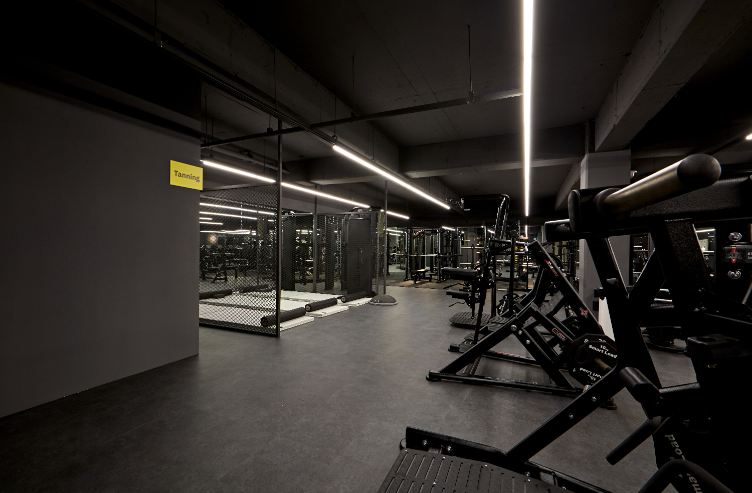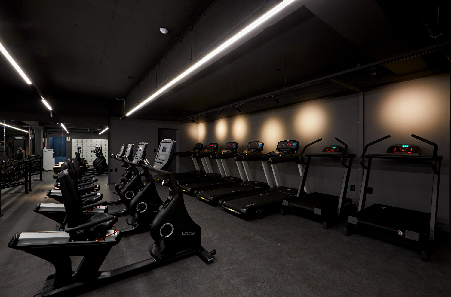 라인 조명을 길게 따라서 시야를 옮기면 메인 운동 공간이 나오는데요. 이렇게 라인 조명을 활용하면 천장이 더욱 트여보이면서 공간이 넓어보이고 개방성을 높일 수 있습니다. 노출 천장으로 시공된만큼 천고가 높고 답답한 느낌을 줄여줄 수 있는데요. 바닥도 시멘트 질감이 느껴지는 그레이톤으로 전체 통일하여 세련되면서도 시크한 매력을 뽐내고 있습니다.