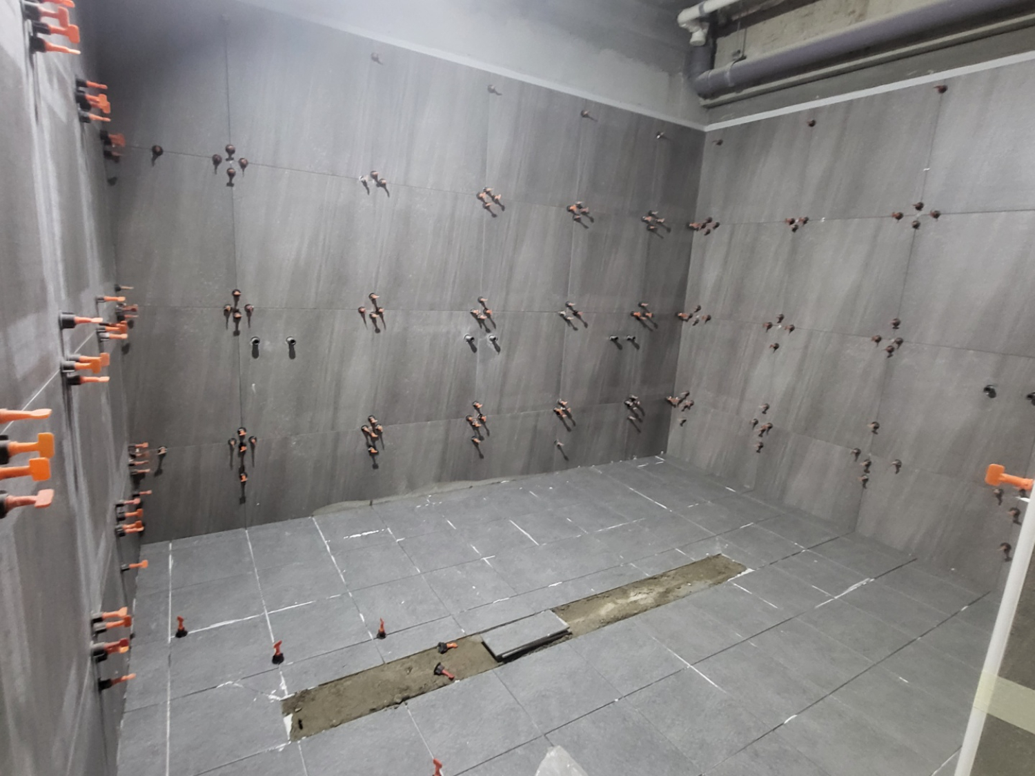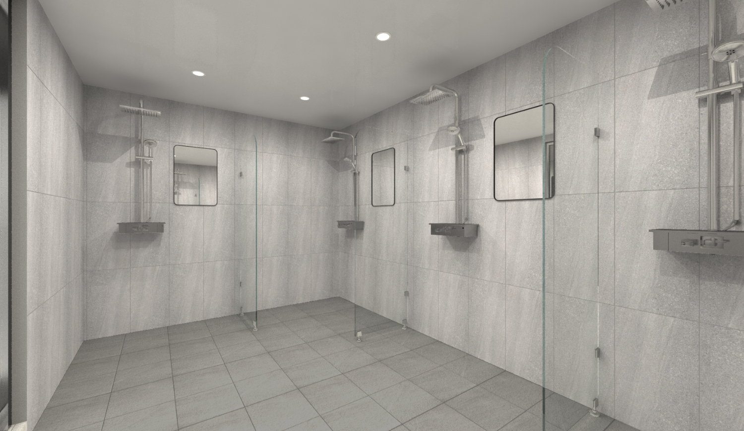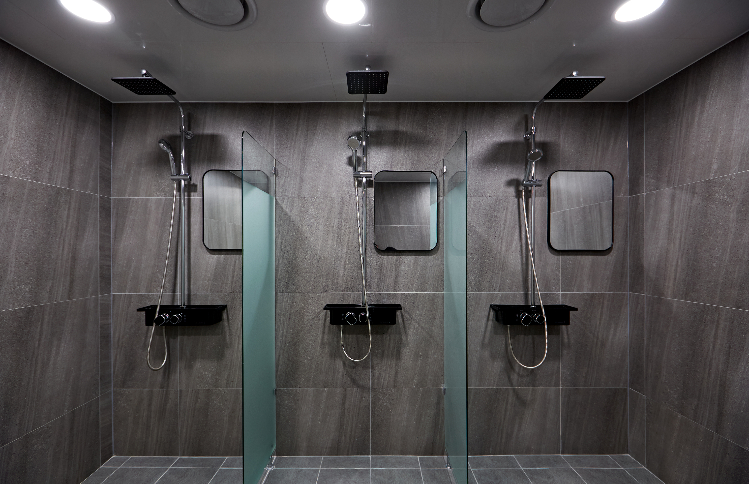 탈의실 및 샤워실도 통일되는 연결성을 유지하면서도 살짝은 밝은 느낌을 내기 위해 연한 그레이톤의 타일로 설정하였는데요. 도시적인 느낌이 강해서 더욱 마음에 든다고 하셨으며 샤워실 내부는 유리로 만든 샤워부스로 공간을 나누어서 각자의 공간을 지켜주면서도 답답해보이지 않는 개방감을 선보였습니다.
