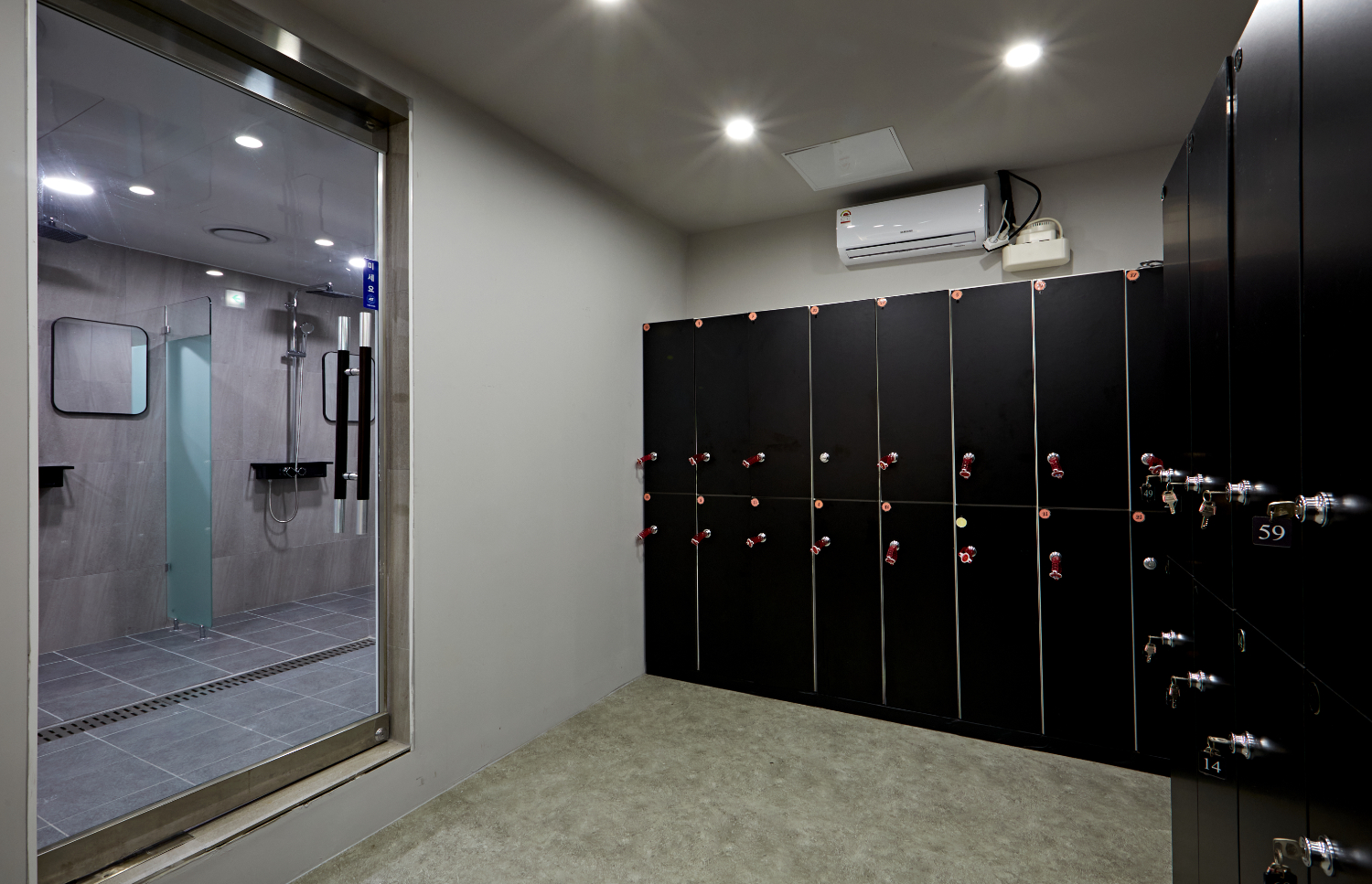 탈의실은 프라이빗함을 높이기 위해서 불투명필름으로 유리 가벽을 시공하였고 칸칸마다의 넓이를 여유롭게 두어서 방해받지 않도록 만들었습니다.